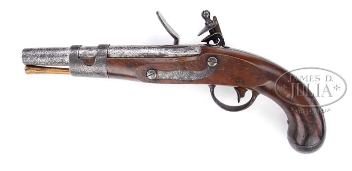 S. NORTH 1813 CONTRACT PISTOL. SN NSN. Cal. 72. 9″ rnd bbl with faceted breech marked “P” over “US” on left bbl flat and “H.H.P” on the right bbl flat, lock marked underneath brass pan “S. NORTH” over-arc, over “U” spread-winged eagle “S”, over “MIDLN, CON” under-arc. In the wood opposite the lock is the inspector’s mark of “V” over “LS” in a circle. Bottom of pan, bbl tang & screw, buttcap & both screws, sideplate, both lock screws and front band marked “II.” indicating orig assembly numbering system at the North factory. Ramrod appears to be orig as does the entire gun. With only 541 delivered to the army, this makes a desirable pistol in orig flint for the discriminating collector. PROVENANCE: Peter Wainwright Collection. CONDITION: Metal shows light pitting over bbl and furniture, slightly heavier at the buttcap. Lock shows its age with slight patina but overall in excellent condition. Overall condition of the stock is fine showing some minor handling nicks and a 5/16″ long stress crack at rear of sideplate, not affecting the soundness of the stock. 4-38187 (3,000-5,000)