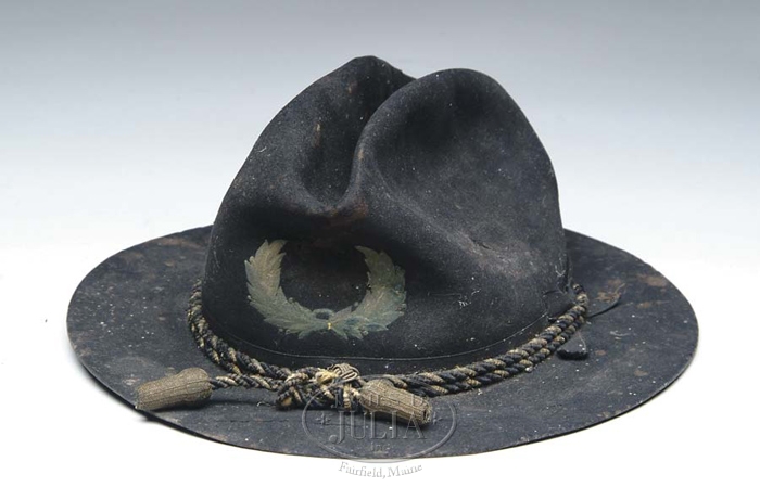 VETERANS ERA SLOUCH HAT. This slouch hat has an embossed/applied hat wreath. Once had insignia inside, now missing. Hat has officer’s style hat cord. 2 1/4” sweat band marked “Lander Hat.” CONDITION: hat is soiled and stained and faded and has several small cracks in brim. Sweat band is intact but torn, with 1” x 1/2” piece missing. 4-56139 JS268 (200-400)