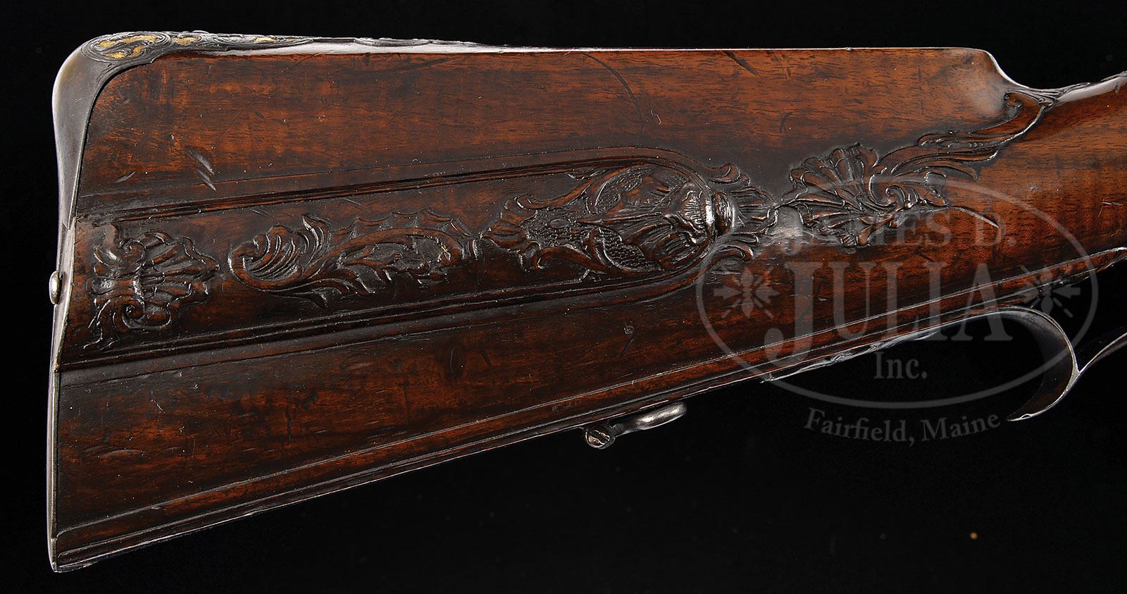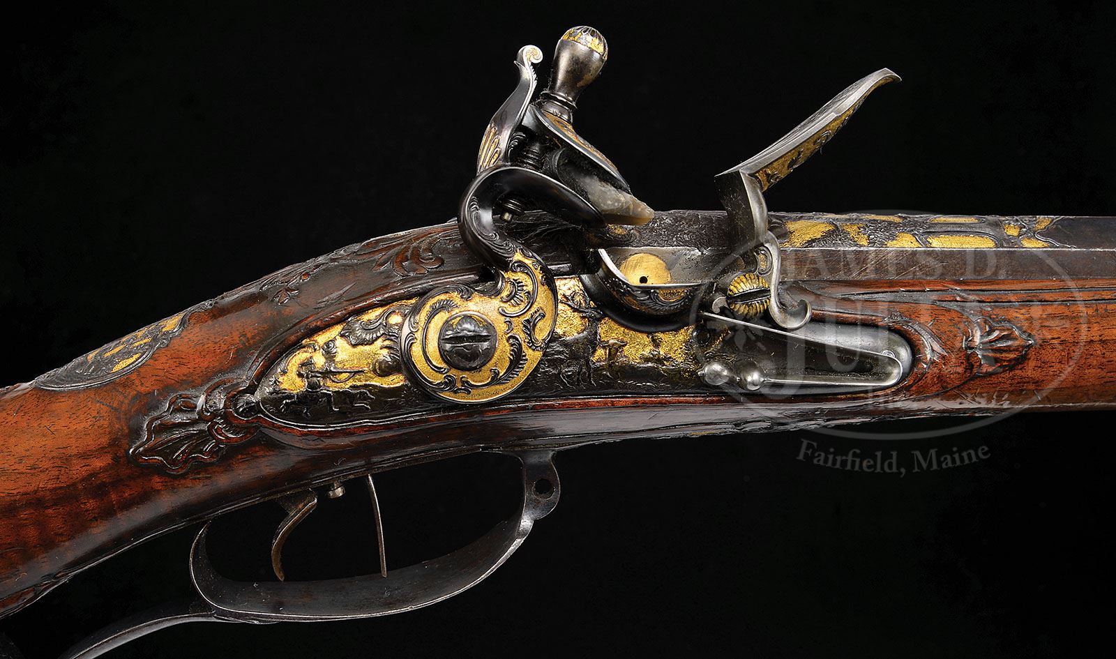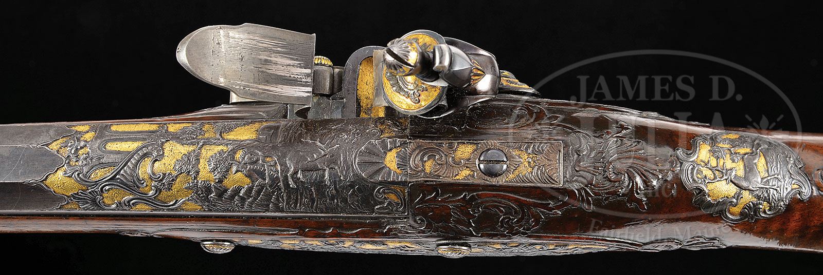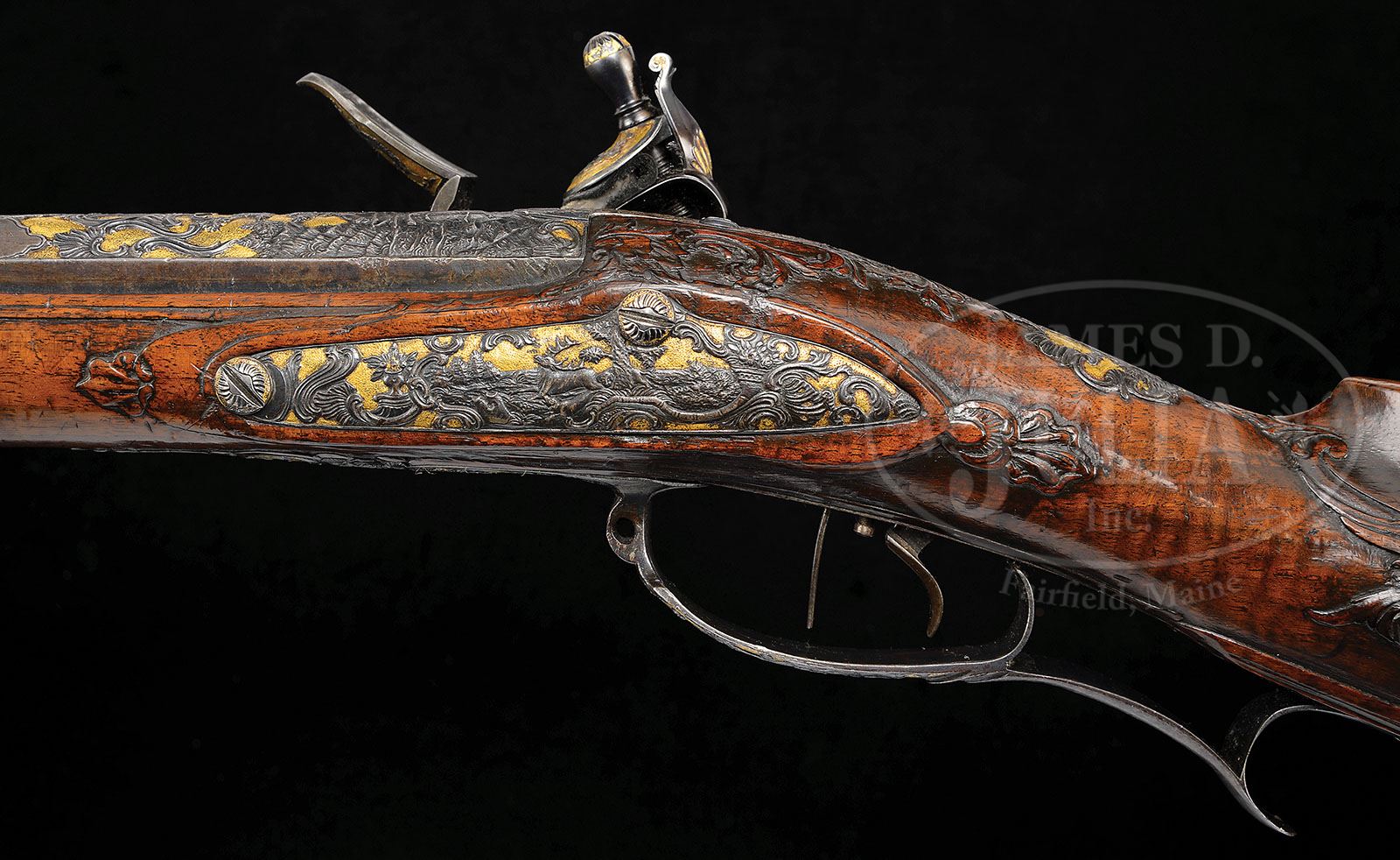ELABORATELY DECORATED NORTH CENTRAL GERMAN FLINTLOCK JAEGER RIFLE CIRCA 1750. SN NSN. The lock is finely chiseled with a German gentleman hunting stag all on a gold ground. The sideplate also chiseled on gold ground with running stag. Trigger guard chiseled with dog attacking a stag. Buttplate features a woman, probably Diana goddess of the hunt holding an arrow attended by dogs. Breech of bbl chiseled with a gentleman holding a wheel lock pistol and a horse in trees. Rear sight chiseled against gold ground. Front sight in a reserve with gold ground. Stock of finely figured walnut heavily relief carved with heavily relief carved patchbox. Rifle is the subject of an article by George Shumway entitled Our Germanic Rifle Heritage at which time rifle was in percussion state. PROVENANCE: See Our Germanic Rifle Heritage, Muzzle Blasts, July, 1992, by Shumway, pp. 10-12; see Jaeger Rifles, 1995, by Shumway. Ex Warren Tom Lewis Collection, Evergreen, CO 2006. Collection of Dr. Douglas Sirkin. CONDITION: Condition of bbl is fine to excellent with considerable orig finish. Lock is reconverted from percussion however the reconversion is of exceptional quality, quite as good as the orig. Stock is excellent overall with extremely good definition to the superb carving. 4-50038 MRZ81 (7,500-15,000)