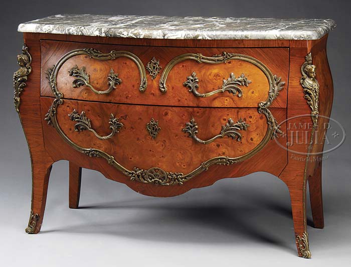 LOUIS XV STYLE KINGWOOD AND BURLED WALNUT MARBLE TOP COMMODE. Late 19th/early 20th Century. Rectangular gray breschia marble top with rounded edges and serpentine front above the rectangular case with bombe sides and front fitted with two long bombe drawers mounted with cast brass scrolling handles cast with leaftips and bordered by scrolling ormolu trim. Raised on outswept angular legs with cast brass sabots and trim. The case with cross banding overall centering burled veneered panels. SIZE: 34-1/4″ h x 48″ overall w x 20″ d. CONDITION: Structurally very good, retains original cleaned finish and original marble. Hardware and ormolu original. 9-98072 (1,500-2,500)