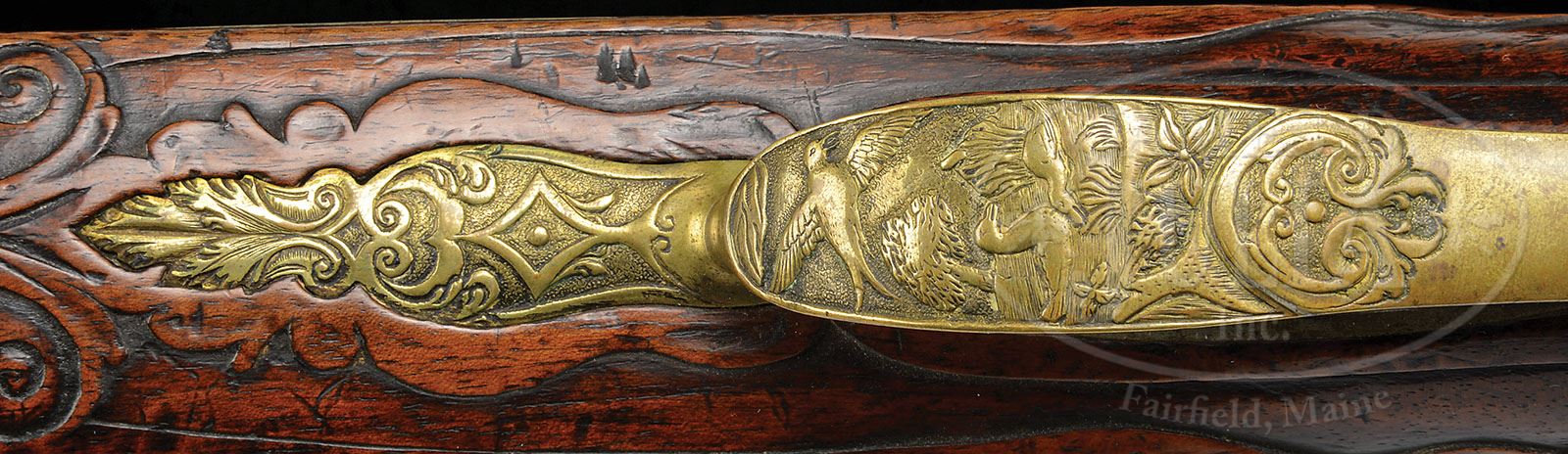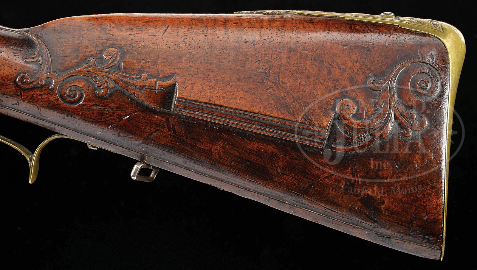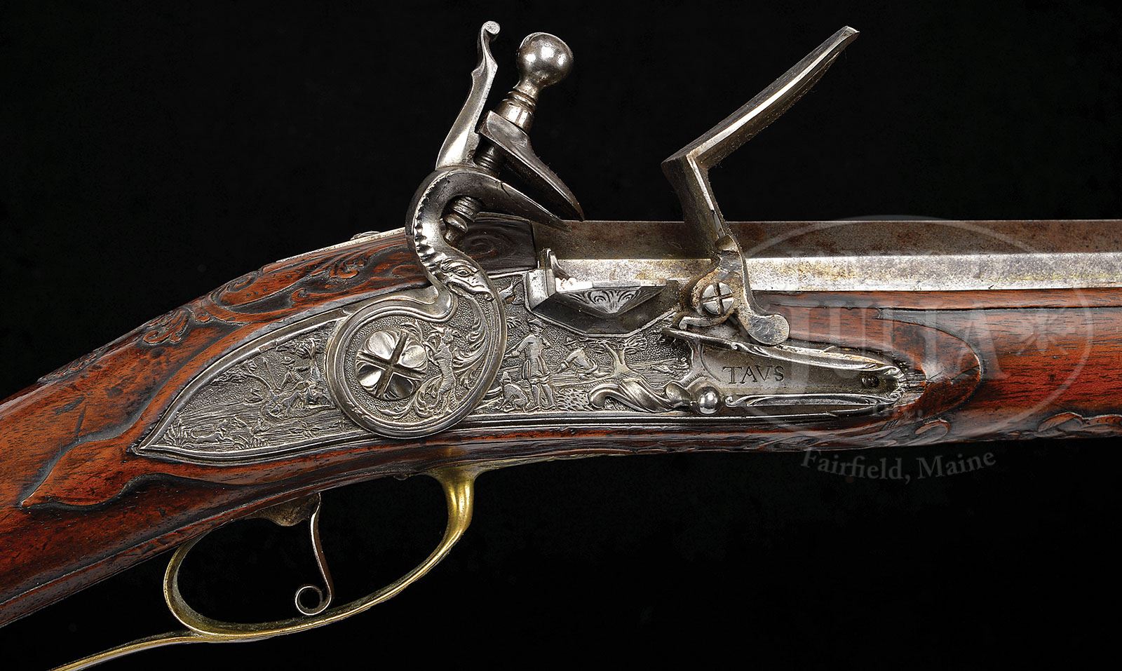 RARE GERMAN FLINTLOCK LONG RIFLE BY WELICSLAUS SPORER IN TAUS, BOHEMIA CIRCA 1710. SN NSN. An extremely rare rifle by one of Bohemia’s most distinguished early gun makers. Lock and cock are finely relief chiseled with hunting scenes and animals. Brass mounts are cast and chased with hunting scene involving fowling. Buttplate, cast and chased with exotic birds. The oct to rnd bbl is exceptionally long measuring 55″. The full stock is finely raised carved with scrolls and a grotesque mask behind the trigger guard. NOTES: although the bbl appears to be rifled for it’s full length, the lack of traditional wheel lock type rear sight and motifs of fowling indicate that this rifle was made primarily for bird shooting. This rifle appears as plate 4 in Henry Kauffmam’s book The Pennsylvania/Kentucky Rifle. As such this rifle should be of interest to collectors of Kentucky rifles. PROVENANCE: Collection of Dr. Douglas Sirkin. CONDITION: Lock is excellent with little to no pitting. Bbl is good with extremely fine pitting throughout and some raised surface rust. Stock is extremely crisp with well defined and sharp carving throughout. Ramrod appears to be the orig. 4-49754 MRZ80 (6,000-12,000)