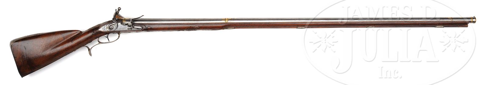 FINE SILVER MOUNTED LONG FLINTLOCK FOWLING PIECE BY PETER WITTEMANN OF GIESSEN (HESSE), CIRCA 1720. SN NSN. This gun is preserved in what can only be called pristine mint condition. The screws retain most of the orig nitre blue. Gun is mounted with a splendid Turkish bbl, probably from a matchlock gun taken during the siege of Vienna in 1673 and carefully preserved until mounted by Wittemann as Turkish bbls were revered throughout Europe as the finest ever made. Bbl is of the very finest Damascus steel, heavily inlaid with pure gold at the breech, muzzle and midway where the 16-side gives way to the round. Bbl also chiseled with a sighting rib. The finest quality throughout. Silver furniture is simple yet elegant. Sideplate engraved with a winged angel driving a chariot pulled by dogs. Thumbpiece is elaborately cast and chased with putti holding up a shield featuring the head of Mars surmounting a panoply of arms. Walnut full stock is finely carved throughout with acanthus leaves and swags. Silver buttplate is relief cast and chased as well. Lock is finely engraved with a recumbent hunter with his gun and dog on a leash. All small parts orig and retaining much original bright polish. PROVENANCE: Warren Tom Lewis collection, Evergreen, Colorado. Schloss Kranichstein, Darmstadt, Germany. Collection of Dr. Douglas Sirkin. CONDITION: Gun is preserved in pristine nearly mint condition throughout. 4-49969 MRZ65 (7,500-15,000)