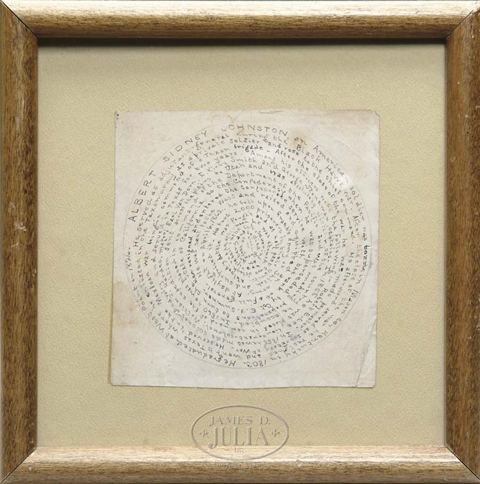 SMALL HANDWRITTEN VICTORIAN CIRCULAR MEMORIAL TO CONFEDERATEGENERAL ALBERT SIDNEY JOHNSTON, CSA. This curious little piece of paper, measuring 3-1/2” x 3-3/4”, has a circle measuring 3-3/8” in diameter and within has tiny writing in concentric circular fashion as follows: “Albert Sidney Johnston, an American soldier, was born in Mason, Co., Kentucky in 1803. He graduated at West Point in 1826. He served as Adjutant General during the Black Hawk War. After the close of the war he resigned and went to Texas where he enlisted in the Texas army as a private soldier and rose to the chief command. He afterward served a Secretary of War. He served in the Mexican War being in command of a Texan brigade. After the close of the war he was made Paymaster. In 1855 he was made Colonel of Cavalry and served in Texas for two years. Among his officers were the following: – Robert E. Lee, Lieutenant – Colonel; William J Hardee, Major; Earl Van Dorn, E. Kirby Smith and George Stonemen, Captains. In 1858 he was placed in command of the expedition sent across the plains into Utah and was the absolute dictator of the country he occupied. In 1860 he was placed in command of the Department of the Pacific and was making preparations to turn the State of California to the Confederacy when he was superseded by Col. E.V. Summer. He resigned and entered the Confederate Service with the Rank of a full General. He was sent to the west and raised and equipped an army. At daylight on April 6, 1862 he fell upon Grant’s army at Shiloh and surprised it. He took 2,000 prisoners in their camps. A bloody battle was fought and at half passed two o’clock in the afternoon he was struck by a rifle-ball in the leg severing an artery and he died from loss of blood”. An interesting and attractive memorial to one of the Confederacy’s first fallen heroes. 4-556025 CW42 (400-600)