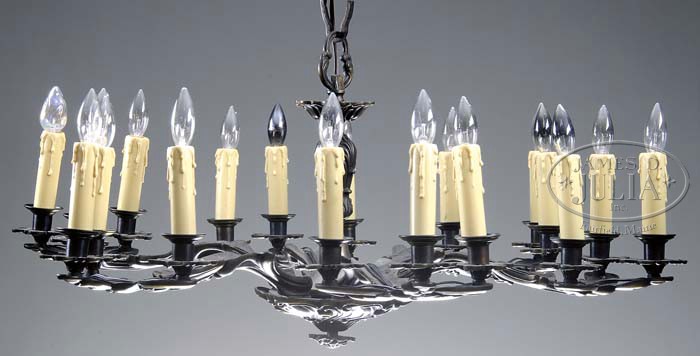 IRON CANDELABRA CHANDELIER. Iron chandelier has center stem in stylized leaf design and supports six arms in matching leaf design that terminate with three electric candle lights on each arm totaling eighteen lights. Chandelier is suspended with a wrought iron chain and is finished with an antiqued brass ceiling cap. SIZE: 32″ dia. CONDITION: Very good to excellent. 5-64078 (300-500)