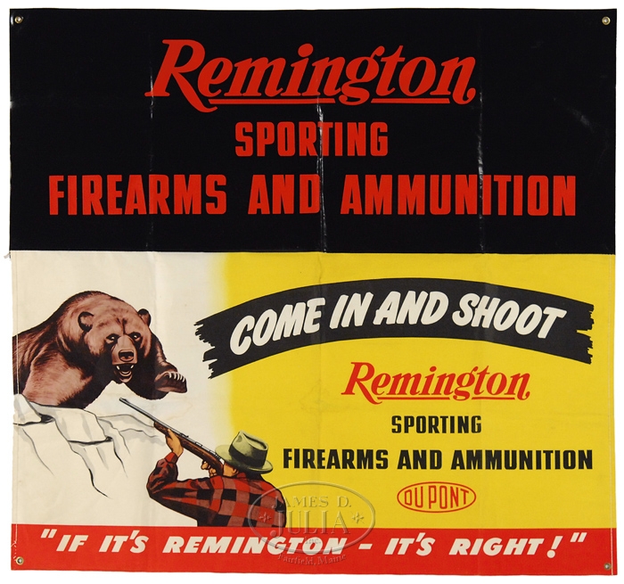 RARE REMINGTON TABLE DRAPE/BANNER. Colorful oil cloth table drape or banner, about 54” long with a 28” drop with the left 1/3 depicting a charging grizzly bear and a 1930’s costumed hunter aiming a bolt action rifle. The right 2/3 has a yellow background with black & red lettering “COME IN AND SHOOT REMINGTON SPORTING FIREARMS AND AMMUNITION” with the du Pont logo below. Bottom 4-1/4” is a red band that states “IF IT’S REMINGTON – IT’S RIGHT!”. Table cover portion – top of banner is 54” x 21-1/2” black oil cloth. It has the “REMINGTON” logo with “SPORTING FIREARMS AND AMMUNITION” in red. There is a grommet in each top corner. CONDITION: Extremely fine. Colors are vivid and bright with only a couple of small spots of water staining. 4-32867 JR632 (2,000-3,500)