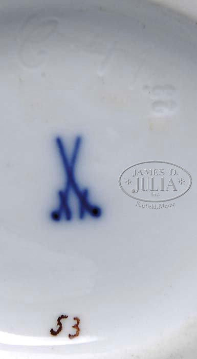 SMALL MEISSEN FIGURAL GROUP. Mid 19th-first quarter 20th century, German. Depicting young boy feeding group of geese and goslings standing beside tree trunk. Incised “C. 41.” with impressed mark “23”. With double swords in underglaze blue. SIZE: 5″ h. PROVENANCE: From a fine New Jersey home. CONDITION: Very good overall. 9-24512 (800-1,000)