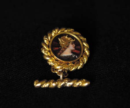 BEAUTIFUL SOLID GOLD VICTORIAN ENAMEL VEST BUTTON. Antique Victorian enameled and solid gold watch fob or vest button. An unmarked solid gold setting with lovely enamel female warriors bust with inlaid gold engraved helmet and armor all set in solid gold ribbed frame with short chain and tie. Circa probably 1870-1880’s. SIZE: Approx. 3/4″ dia. CONDITION: Very good to excellent. 5-70238 (350-650)