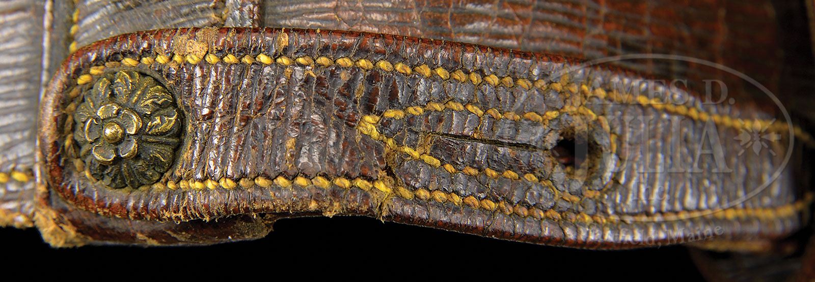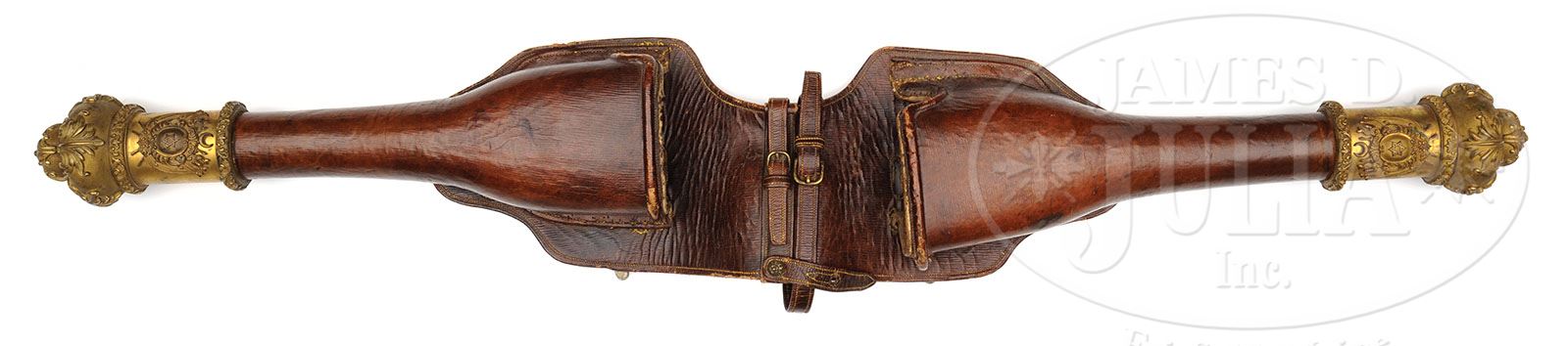 MASSIVE AND MAGNIFICENT PAIR OF OTTOMAN SADDLE HOLSTERS FOR FLINTLOCK PISTOLS, CIRCA 1840. Of museum quality, this unique pair of holsters features superbly cast and chased gilt bronze mounts with the high raised relief seal representing the Ottoman Empire, crescent moons and star of David. The bottom with bulbous florals in two stages. The heavy leather bodies molded and lined. Straps stitched and intact. NOTE: All together, the most impressive pair of saddle holsters we have seen in many years. PROVENANCE: Collection of Dr. Douglas Sirkin. CONDITION: Bronze mounts retaining much bright original gilding. Leather retains most of its original polish and finish. Stitching largely intact. Some minor worming here and there. 4-49818-1 MZ15 (4,000-6,000)