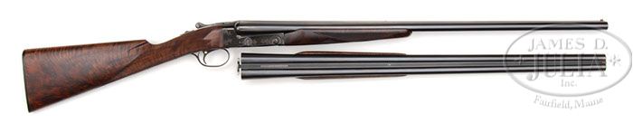 *WINCHESTER MODEL 21 – 1 CUSTOM WITH 20 GAUGE AND 28 GAUGE BARRELS. SN 16593. Cal. 20 ga with 2-3/4″ chambers/ 28 ga. with 2-3/4″ chambers. 28″ Bbls. Both bbl sets feature raised, concave, matted solid ribs with two beads, and are engraved “CUSTOM BUILT BY WINCHESTER” on milled out portion at rear of rib. Bbl flats are stamped with SN, gauge, Winchester proofs, and chamber length. Bottoms of bbls are stamped “WINCHESTER PROOF STEEL” and with chokes. Each bbl set has its own beavertail forend, marked “1” and “2” corresponding to same numbers stamped on loops. Small round bodied action with second type water table markings, is engraved in standard pattern “1” style, with flourishes of scroll. Beautifully flame figured red toned American walnut buttstock measures 14-1/8″ over composition Winchester buttplate, and features standard point pattern checkering with beaded borders. Matching beavertail ejector forends have typical Winchester knurled roll and spring releases. 20 Ga. BBLS no. “1”: Bore diameter: left -.615, right -.618. Bore restrictions: left -.012, right -.012. Wall thickness: left -.029, right -.028. Drop at heel: 2-1/8″, drop at comb: 1-3/8″. Weight: 6 lbs. 6 oz, LOP 14-1/8″. 28 Ga. BBLS no. “2”: Bore diameter: left -.549, right -.549. Bore restrictions: left -.029, right -.012. Wall thickness: left -greater than .050, right -greater than .050. Drop at heel: 2-1/8″, drop at comb: 1-3/8″. Weight: 7 lbs. 6 oz, LOP 14-1/8″. CONDITION: Excellent, as competently refinished. Wood and metal retain essentially all of factory quality sympathetic finishes. Engraving on action is very slightly softened. There are only one or 2 very slight handling marks. Bores are excellent. Action is tight. Mechanically crisp. 4-46367 MGM72 (15,000-25,000)