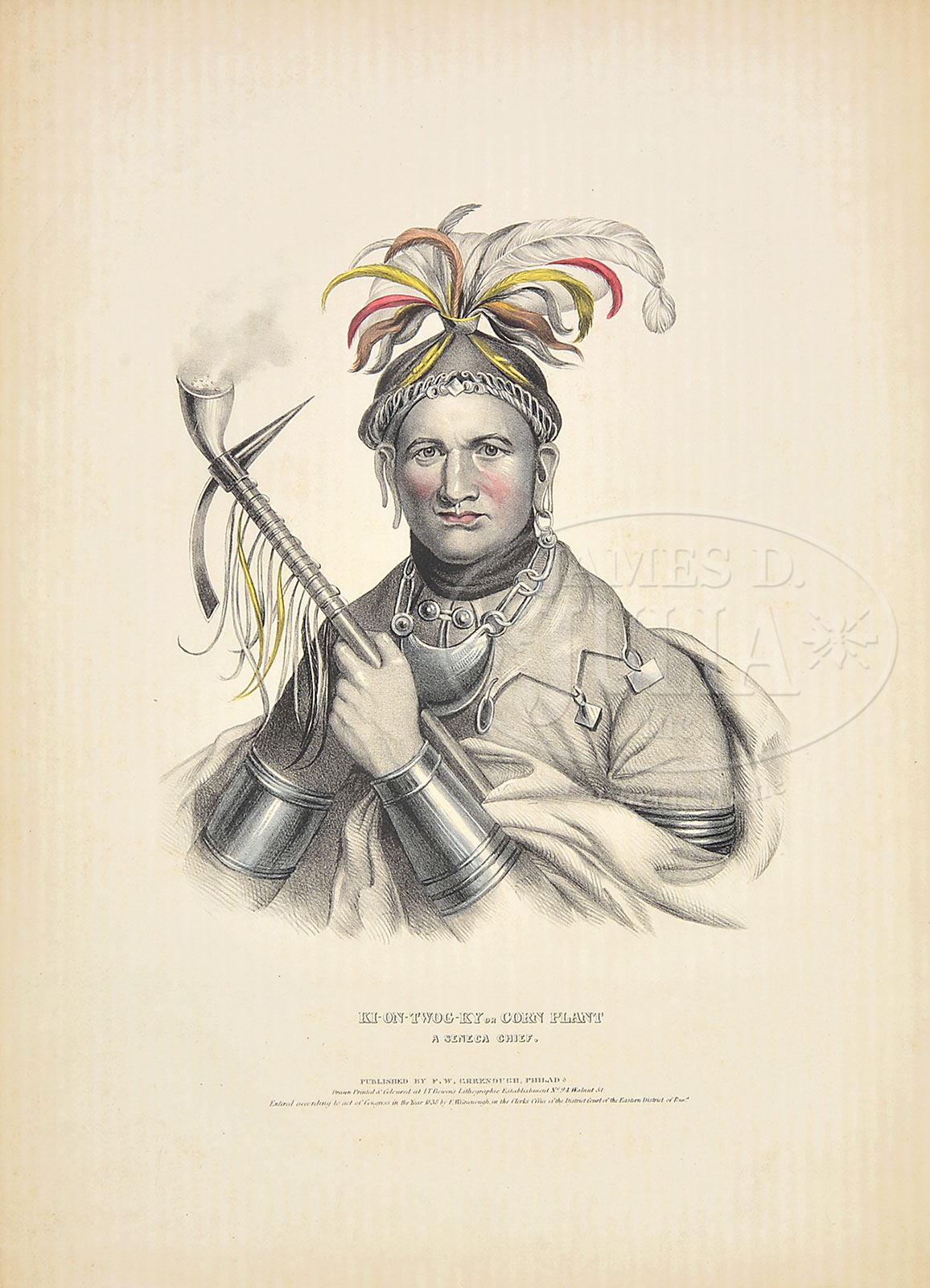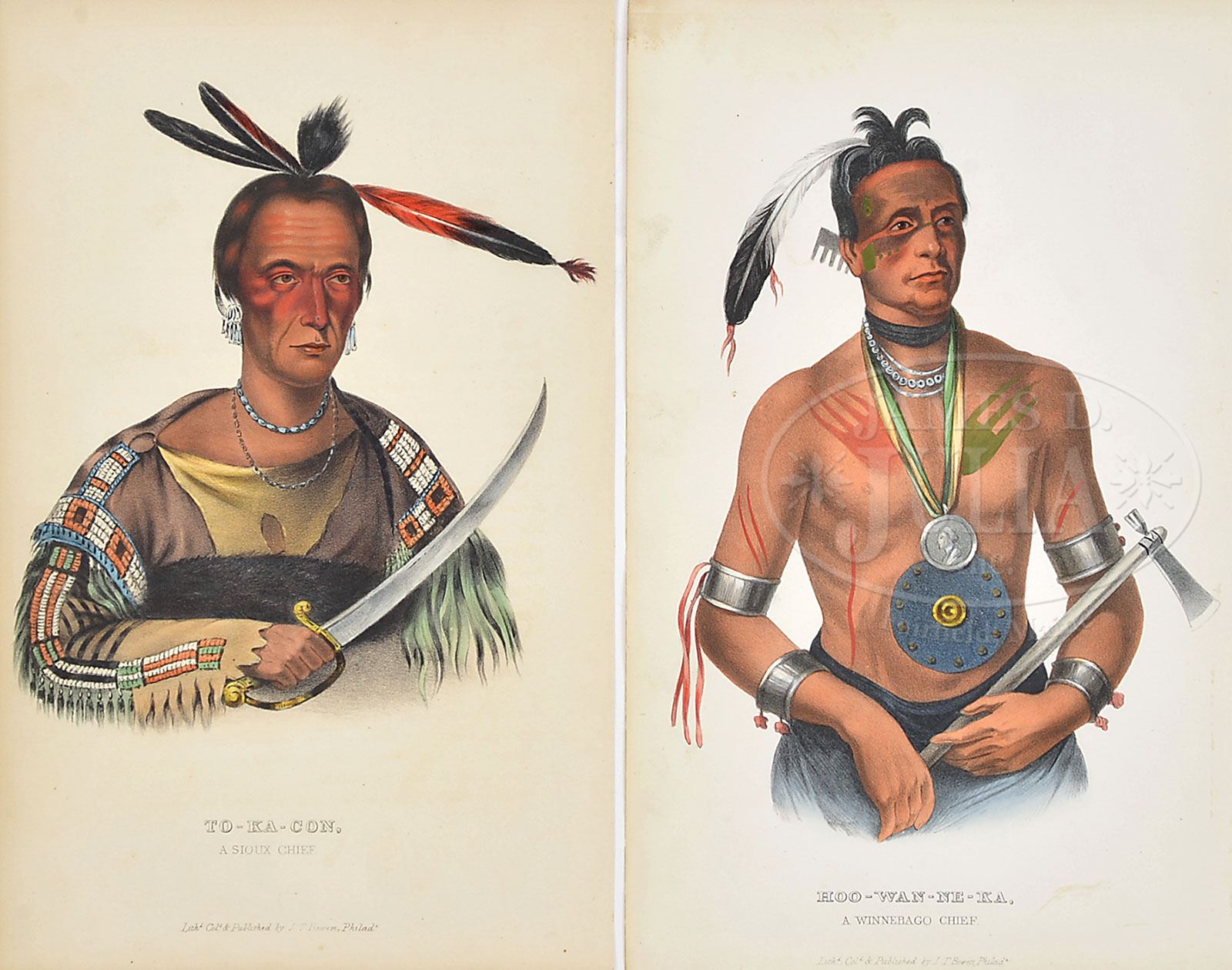 EIGHT COLORED PRINTS OF NATIVE AMERICANS. 1) “KI-ON-TWOG-KY or CORN PLANT”; published by F.W. Greenough, Philad. 1836. 2) “RED JACKET”. 3-8) “AP-PA-NOO-SE”, “MON-KA-USH-KA”, “TO-KA-CON”, “HOO-WAN-NE-KA”, “CHOU-CA-PE”, and “POW-A-SHEEK”; lithographed, colored, and published by J.T. Bowen, Philad. Note: Text pages included for 3-8. SIZE: 1) 21-1/2″ x 15-1/4″. 2) 11″ x 8″. 3-8) 10-1/2″ x 6-1/2″ CONDITION: Very good 9-29592 (500-1,000)