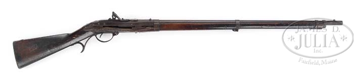 TEXAS CONFEDERATE ALTERATION OF HALL RIFLE. Cal. 64. The following described gun was found in Texas and is a most unusual alteration to percussion. Mr. Michel, in his notes, describes this gun as follows: “Alteration to percussion of Model 1819 Hall rifle. Breechblock marked ‘J. H. Hall / H. Ferry / U. S. / 1831’. This alteration performed by a striker inserted between the jaws of the hammer with a percussion nipple screwed into the former pan. This example was recovered in Texas and shows the effect, not uncommon, of a blowout resulting from loose powder being ignited inside the breech. Wood on the right side has been completely blown away alongside the breech and striker. Top jaw and jaw screw of hammer shorn off”. Similar examples are described, but not shown, in Murphy & Madaus. PROVENANCE: Ben Michel. CONDITION: Gun appears in as-found condition. All metal parts are brown and pitted. Stock exhibits several breaks and missing approx. 11″ section on right side as described above allowing mechanism to be shown. Gun lacks ramrod and top jaw and striker to nipple. 4-38744 JS60 (2,000-4,000)