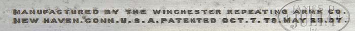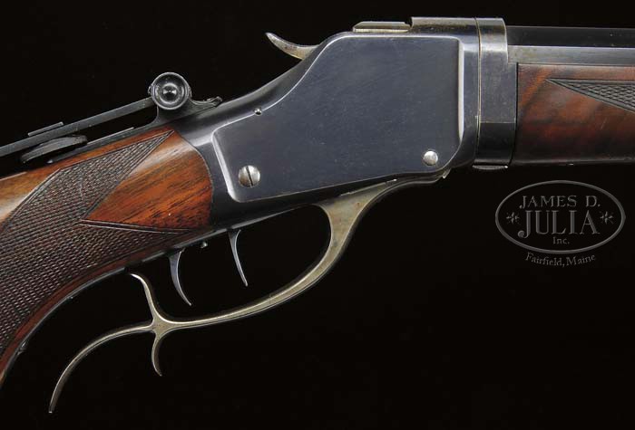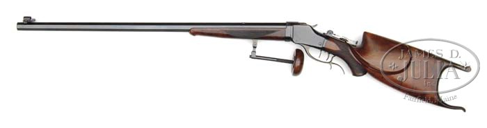 *DESIRABLE WINCHESTER MODEL 85 TAKEDOWN SCHUETZEN RIFLE. SN 108200. Cal. 32-40. 30″ No. 3 oct bbl, wind-gauge front sight with level, marble marked blank in rear seat. Top flat of bbl is marked “MANUFACTURED BY THE WINCHESTER REPEATING ARMS CO./ NEW HAVEN. CONN. U.S.A. PATENTED OCT 7. 79. MAY 23. 07.” Adjacent takedown ring and top of receiver have “WP” proof marks. Left flat at takedown ring “32-40”. Standard takedown receiver with Schuetzen double set triggers, spur finger lever and top tang equipped with 3″ Vernier sight. Mounted with highly figured “xxx” walnut, checkered pistol grip with Winchester hard rubber grip cap, Schuetzen buttplate and left side cheekpiece. Checkered schnable forend with ebony tip insert equipped with palm rest. Accompanied with Winchester Gun Museum letter that is quite interesting as this serial number is apparently listed twice. Both entries are very similar, first one being noted as being shipped Novemebr 20, 1911, delivered to Bostwick Braun Company, Toledo Ohio, on consignment. Returned and re-shipped on many occasions. Second entry reads as follows, “the other is rifle caliber 32-40, 30″ octagon barrel No. 3, Schuetzen set trigger, takedown, checked stock, pistol grip, cheekpiece, Laudensack model buttplate, palm rest, spur finger lever, mid-range Verier peep sight, wind gauge front sight, no rear seat, shipped September 25, 1909. No other information listed.” Except for added rear sight dovetail letters as found. Inspection of inside lower, left tang reveals Assembly marks “US 9665x 7004(with double strike-through) xUS”. The “9665” number is found on back of stock and inside toe of buttplate, twice. CONDITION: Fine. Bbl retains 95% orig blue, thinning on sharp edges, a short area of cleaned oxidation spotting showing silver patina, mostly on top flat between forend and muzzle. There are some minor ping marks on each side of rear dovetail and typical minor, small nicks and scratches. Receiver and takedown ring have 95% orig blue, thinning on top and blending with gray patina, thinning on sharp edges and a couple of minor nicks and scratches. Stock is sound with good checkering, some minor nicks and scratches and retains orig varnish finish. Forend is sound with good checkering. A few minor nicks and scratches and retains orig varnish finsih and some minor flaking. Base for palmrest shows silver patina. Mechanics are crisp, including double set triggers with a bright shiny bore. 4-41339 BDT154 (6,000-10,000)
