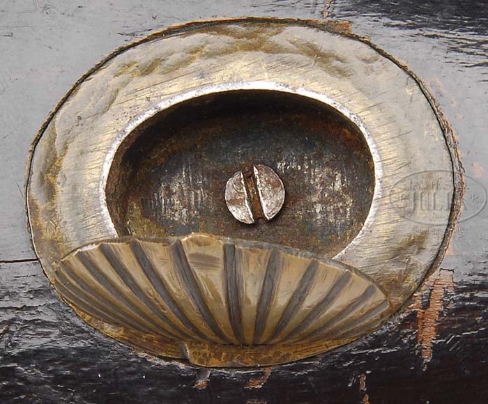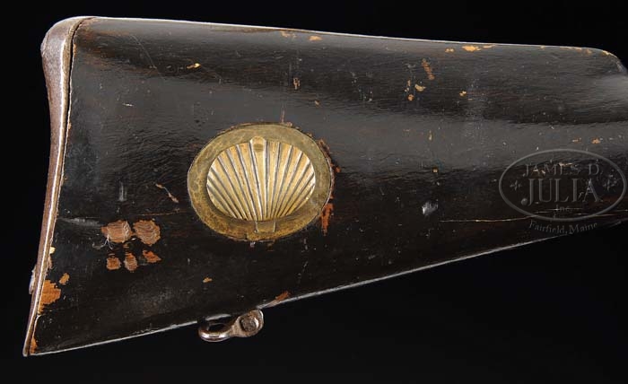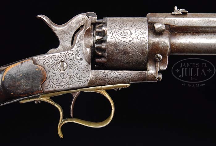 LEMAT REVOLVING PERCUSSION CARBINE. Cal. 42. Though Lemats were made in France, most serious Confederate collectors consider these primary Confederate weapons as Lemat was making guns under Confederate contract. Lemat revolving percussion carbines were the only foreign made long guns and repeating shoulder guns made specifically for the South during the Civil War. John Murphy and Howard Madaus in their “Bible on Confederate Carbines” states of the 125 or so carbines made only 18 are known, this being one of the most unusual in that it has an added shell-shaped patchbox and an engraved frame and cylinder. This particular gun, SN 60, is pictured on pgs 161 and 162 in this text. In the June 1968 issue of “The Gun Report” Harry H. Mann describes and pictures this gun in an article titled “The Lemat Grapeshot Carbine”. Mann speculates that this carbine was an officer’s model. He points out an atypical feature of the spur triggerguard rather than the typical configuration on other carbines. The shell-shaped box in stock he stated was for the use of caps. This is a most unusual and attractive gun and the only known engraved model. PROVENANCE: Ed Simmons Collection. CONDITION: Metal surfaces are gray/brown with scattered staining and pitting. Action works some times. German silver triggerguard is bent. Wood stock has areas of chipping, scratches and scrapes. Loading arm is probably a replacement. Markings on bbl are discernible but light, especially SN on right side of frame. 4-37489 JS41 (20,000-30,000)