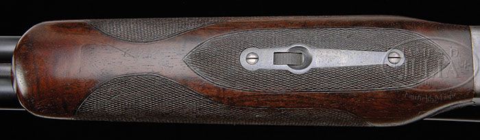 *16 GAUGE WINCHESTER MODEL 21 TOURNAMENT SKEET. SN 7133. Cal 16 ga. 2-5/8″ Chambers. Standard configuration with 26″ bbls having type 2 markings on left bbl and correct markings on bottoms of bbls. Action with second type markings on water table, is stamped “Tournament Skeet” on trigger plate, and is fitted with non-automatic safety, and blued selective trigger. Gun also features unbraced beavertail forend, and nicely figured American walnut straight grip point pattern checkered buttstock with checkered wood skeet butt. Bore diameter: left -.666, right -.666. Bore restrictions: left -.009, right -.003. Wall thickness: left -.032, right -.030. Drop at heel: 1-15/16″, drop at comb: 1-7/16″. Weight: 6 lbs. 12 oz, LOP 14″. CONDITION: Very fine. Bbls retain approx 80% orig blue, with considerable flecking, thinning at breeches. Action retains approx 70% of its orig blue, silvered on sharp edges, fences, and around bottom from normal hand wear. Trigger guard is silvered and browning on tang. Stocks retain most of what appears to be their orig varnish finish, worn through and darkening at comb, around side panels, and at grip. Forend is considerably darkened and worn. Bores are excellent. Action is tight. Mechanically fine. 4-46808 MGM233 (8,000-12,000)