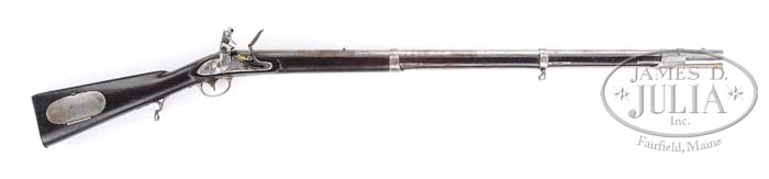 US MODEL 1819 S. NORTH COMMON RIFLE. 58 cal, 36″ long rnd bbl, rifle dated at breech tang “1827” and marked near breech “US/AH/P’ within a rosette (Asabel Hubbard). Additional marked with sub-inspector “H’ on the left bbl flat. Lock marked under brass pin “U.S./S/NORTH.” and reading in three lines vertically behind the cock “MIDLtn/CONN./1826”. Inside of lockplate is marked with “//” as well as the pan screw, pan, bridle screws, bridle, cock top jaw screw, on the battery and battery screw indicating this lock is in original flint configuration. Iron furniture includes orig ramrod, bbl bands, trigger guard, both sling swivels, patch box, butt plate marked “US” on tang. Walnut stock marked on left side opposite the lock within a circular cartouche and faintly marked in script, “AH”. PROVENANCE: Charles Radcliffe Collection where he acquired it from the C. Meade Patterson Collection, November 11, 1999 at Conestoga Auctions, lot 399. Meade purchased it from Oscar DePrato of Silver Springs, Maryland in 1956. CONDITION: All metal has been cleaned at one time still showing light pitting with medium concentrations on the breech area around the touch hole. Walnut stock is in very good condition with evidence of a 1/4″ x 1/4″ triangular area burned away behind the brass flash pan. Also there is a 1/4″ stress crack originating at the tail of the lock not affecting soundness of stock. 4-39622 PAS64 (3,000-4,000)