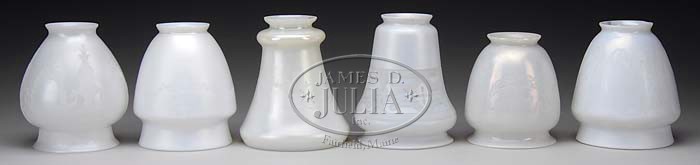 SIX STEUBEN ACID CUT BACK ART GLASS SHADES. Six individual art glass shades of various designs and shapes, each being a Steuben acid cut back design. Finishes vary from soft matte to highly iridescent. Two are signed with Steuben fleur de lis marks. SIZE: Range from 4-1/2 to 5-1/2″ t x 2-1/4″ fitters. CONDITION: Very good with minor fitter chips that are concealed when in place. 5-68270 (400-600)