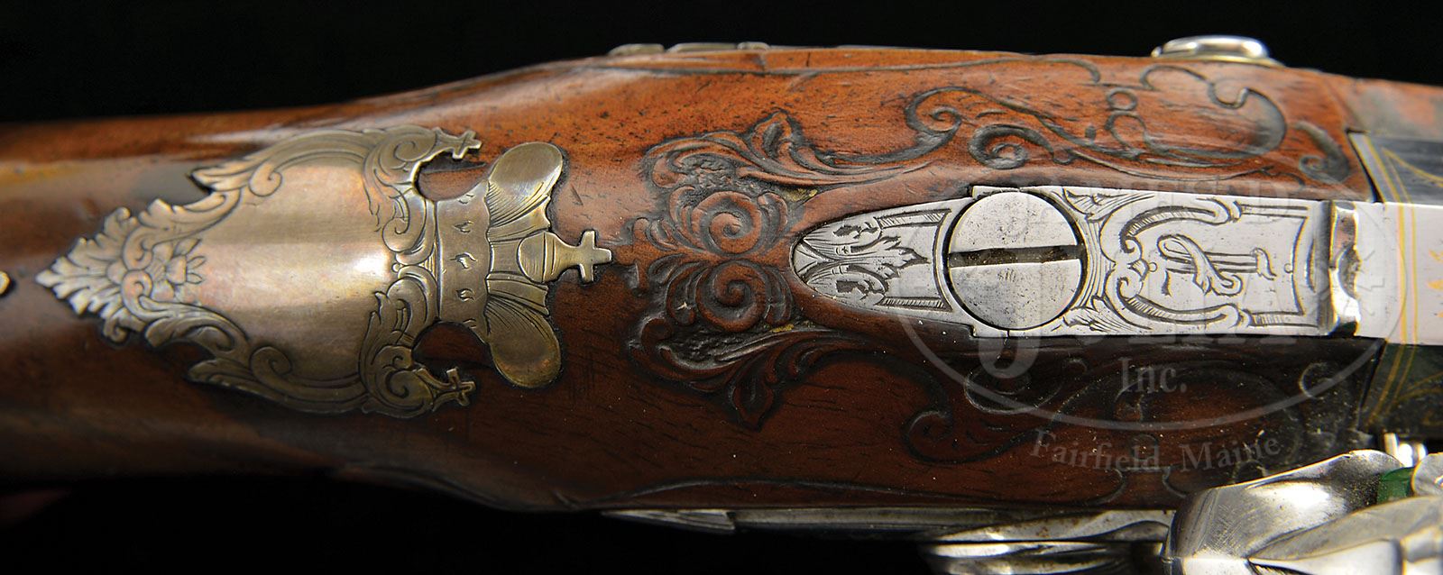 FINE PAIR OF VIENNESE FLINTLOCK PISTOLS BY ANTON KLEIN. SN NSN. Cal. .482 at muzzles. 11-1/2″ Octagonal to 16-sided with wedding band transition bbls, are gold inlaid “Anton Klein in Wienn.” (1753 – 1782) on top flats, and also have inlaid gold filigree at breech ends. Touch holes are gold lined. Silver front sights are inlaid into front portions of bbls in four pointed stars. Bbl tangs with integral sights are numbered “1” and “2”. Locks with inset rounded pans have unbridled friction frizzens, and are mounted with round bodied serpentine cocks. Lockplates are rounded and have deep cove molded chamfers. There are some flourishes of scroll engraving and “Anton Klein” “In Wienn” is under each pan. Nicely marbled, dense, European walnut stocks have cove moldings along ramrod channels, and raised moldings around trigger guard finials, which terminate in relief carved scroll. There is more relief carving around bbl tangs. Stocks extend to muzzles and terminate in silver caps, and are pinned to bbls. All furniture is of silver, including fancy square backed trigger guards, large rear plates on birds head grips, crest plates, and terminate in crown motifs. Heavy sideplates are deeply chamfered and have light scroll engraving. Hickory ramrods with silver tips mount through octagonal pipes with beaded ends. Tailpipes have finials matching trigger guards. PROVENANCE: Collection of Dr. Douglas Sirkin. CONDITION: Fine. All steel parts are polished to bright silver over some light pitting, engraving slightly softened, but flats of bbls and sharp edges are perfectly preserved. Stocks are very fine with hand worn patina. Carving is slightly rounded. Silver is toned, engraving slightly rubbed. A beautiful pair of very high quality pistols. 4-49907 MGM327 (10,000-15,000)