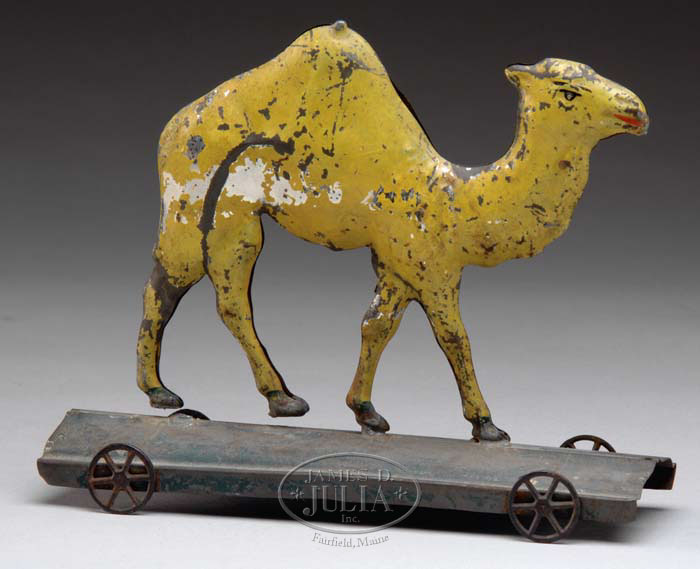LARGE EARLY AMERICAN TIN CAMEL TOY ON PLATFORM. This toy made by Althoff Bergman dates to approximately 1880. The camel in original yellow paint with red mouth is mounted on a green base with small cast iron wheels. SIZE: 9″ l x 7-1/4″ h. CONDITION: Scattered paint flaking missing all over the surface of the camel and base. A piece of the tin on one side of the leg also missing. This is a scarce toy; and for this early a toy, in very acceptable condition. 1-7680 (500-800) Auction: Advertising, Toy & Doll - Spring 2007 Please Note: All prices include the hammer price plus the buyer’s premium, which is paid by the buyer as part of the purchase price. The prices noted here after the auction are considered unofficial and do not become official until after the 46th day. |