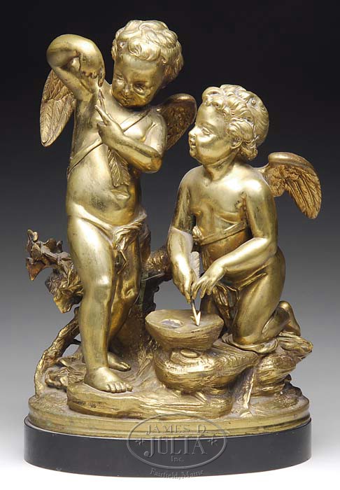 JEAN-LOUIS GREGOIRE (FRENCH 1840-1890), TWO WINGED CHERUBS WITH ARROWS. Cast figural bronze depicting two winged boys, one kneeling and one standing before a tree stump, each examining an arrow. On a rocky plinth mounted on a conforming oval naturalistic base, inscribed “L. GREGOIRE” beneath the standing figure. SIZE: 12-1/2″ overall h. Figure: 11-1/2″ h. x 8-1/4 w. CONDITION: With good gold patina. Chip on marble base, small screw protruding from proper right side of torso of standing figure, indicates absence of an element. Otherwise very good. 9-95098 (1,000-2,000)