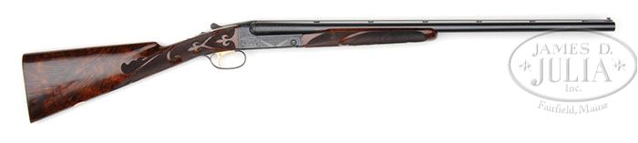 *EARLY C S M MODEL 21 PIGEON GRADE 16 GAUGE WITH CASE. SN W38152. Cal. 16 ga. 2-3/4″ Chambers. 26″ Bbls with raised, matted, ventilated rib have 3-1/2″ triangles of simple scroll at breech ends. Engine turned bbl flats are stamped with SN, gauge, and chamber information, as well as WS proofs. Loop is stamped with “CT. Shotgun Mfg. New Britain, CT. U. S. A.” There are no stampings on left bbl. Flat side action is engraved in 21-6 style having setter and pointer on either side and pheasant on bottom with deep relief carved oak leaf fences. Action features non-automatic safety and gold-plated single selective trigger. Trigger guard is gold inlaid “Pigeon Grade” at grip. Exceptional XXXX feather crotch American walnut straight grip buttstock measures 14-1/2″ over checkered wood butt, and has vacant gold oval on toe line, and is checkered with 21-B carved pattern of fleur-di-lis and ribbons. Matching beavertail forend has inset ebony forend tip, and engine turned iron. Bore diameter: left -.663, right -.663. Bore restrictions: left -.013, right -.007. Wall thickness: left -.031, right -.030. Drop at heel: 2-1/4″, drop at comb: 1-1/2″. Weight: 6 lbs. 13 oz, LOP 14-1/2″. Brown oak and leather case with brass corners has leather trimmed canvas outer cover, is lined in burgundy cloth, and has oak trimmed partitions. Case contains 2-pc cocobolo and brass cleaning rod with mops and brushes, pair of Orvis marked snap caps, and a pull-through cleaning snake. CONDITION: Excellent, near new, with only a few light handling marks on wood and metal. Bores are excellent. Mechanically crisp. Case leather is excellent. Interior cloth has some slight tears from contact with extractors. Accessories are excellent. Outer cover is excellent, with a few marks and scuff on leather corners. 4-46729 MGM217 (15,000-20,000)