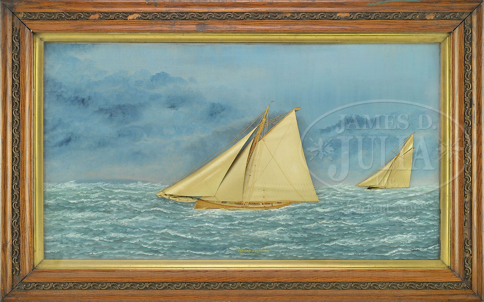 Please Note: Artist is “Thomas H. Willis, American 1850-1925”. OUTSTANDING SILK, VELVET, AND OIL PAINTING OF THE AMERICA’S CUP YACHT RACE BETWEEN “PURITAN” & “GENESTA” SEPT. 24, 1885 BY THOMAS H. WILLIS (American, 1850-1925). The scene depicting the two yachts sailing right to left in pursuit of the America’s Cup. The ocean is shown with choppy white-tipped waves under a blue sky. Housed in an antique oak gilt lined frame with some losses behind glass. At center-bottom written with title “PURITAN & GENESTA SEPT. 24, 1885″ SIZE: Sight: 19-1/2″ x 35-1/2”. Overall: 27″ x 43″ CONDITION: Very good 9-28441 (3,000-5,000)