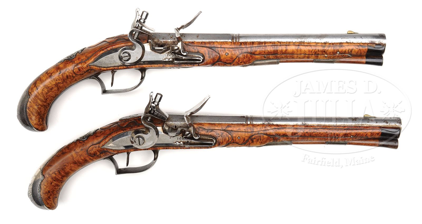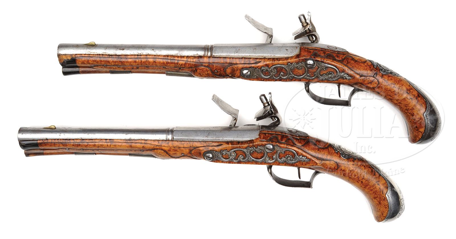 FINE SILVER MOUNTED PAIR OF GERMAN FLINTLOCK HOLSTER PISTOLS SIGNED BY I.C. KNUST, MECKLENBERG, CIRCA 1760. Very fine quality German holster pistols remain in virtually pristine untouched condition throughout. The stump maple full stocks are finely molded around lock, bbl tang, sideplate and ramrod. The locks retain nearly all of their bright polish from 1760. The full silver mounts are finely engraved throughout with well-pierced and chased openwork sideplate. The silver thumbpieces are engraved with an unidentified coat of arms consisting of a crown over a stag. Bbl of Spanish form octagonal to round is slightly swamped toward the muzzle with brass foresight. NOTES: These pistols are in splendid condition throughout and would appeal to the most discriminating collector of fine pairs of flintlock pistols. CONDITION: Remarkably these pistols remain in pristine untouched condition throughout with no replacements including ramrods and with the exception of a few extremely minor age cracks and some hornworm damage to the forend cap of one pistol. 7-73582 MRZ57 (5,000-7,000)