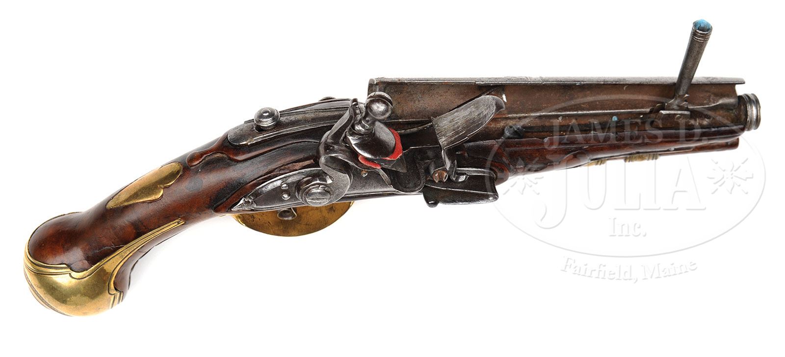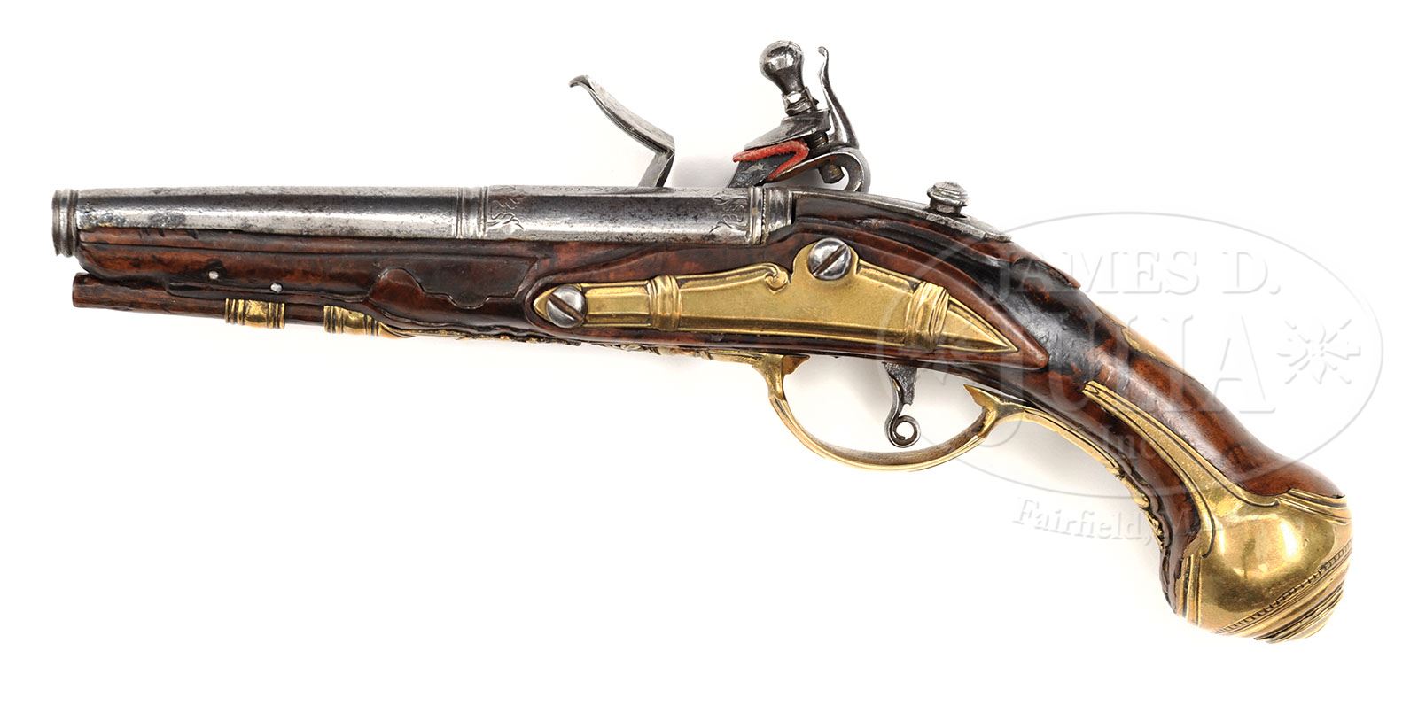 18TH CENTURY ITALIAN FLINTLOCK LIGHTER PISTOL. This unusual item has the look of a small caliber pocket pistol, however depressing button on tang, top half of 5″ steel bbl marked “Antonio : Chogi” springs open, and a small candle holder flips into upright position. Lock with inset slightly faceted pan, unbridled friction frizzen, and flat faced serpentine cock, has lockplate with pronounced camber and deep chamfers of the type found in the early 18th century. Fruitwood stock has raised moldings around lockplate, bbl tang, and sideplate. All furniture is of brass, and includes heavy knob butt cap, and relief cast trigger guard and ramrod thimble. A very interesting piece. PROVENANCE: Collection of Dr. Douglas Sirkin. CONDITION: Fine. Steel parts are cleaned to silver patina. Stock wood has warm hand-rubbed glow. Brass furniture cleaned, but toning back to a golden yellow, details still excellent. 4-50134 MGM325 (3,000-5,000)
