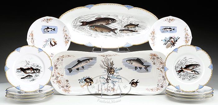 2 HAND DECORATED 19TH CENTURY PORCELAIN FISH SETS. Consisting of a gold and blue accented scalloped rim set with oval 22-3/4″w platter and eight 8-3/4″d plates with various background settings and species of fish; the other with a 24-1/2″w rectangular platter and twelve 9″d shaped rim plates with various species, marked overglaze “1459/58”. PROVENANCE: From the “Harp House” of Camden, Maine. CONDITION: One chip to two plate rims, otherwise, good overall. 9-26975 (1,000-1,500)