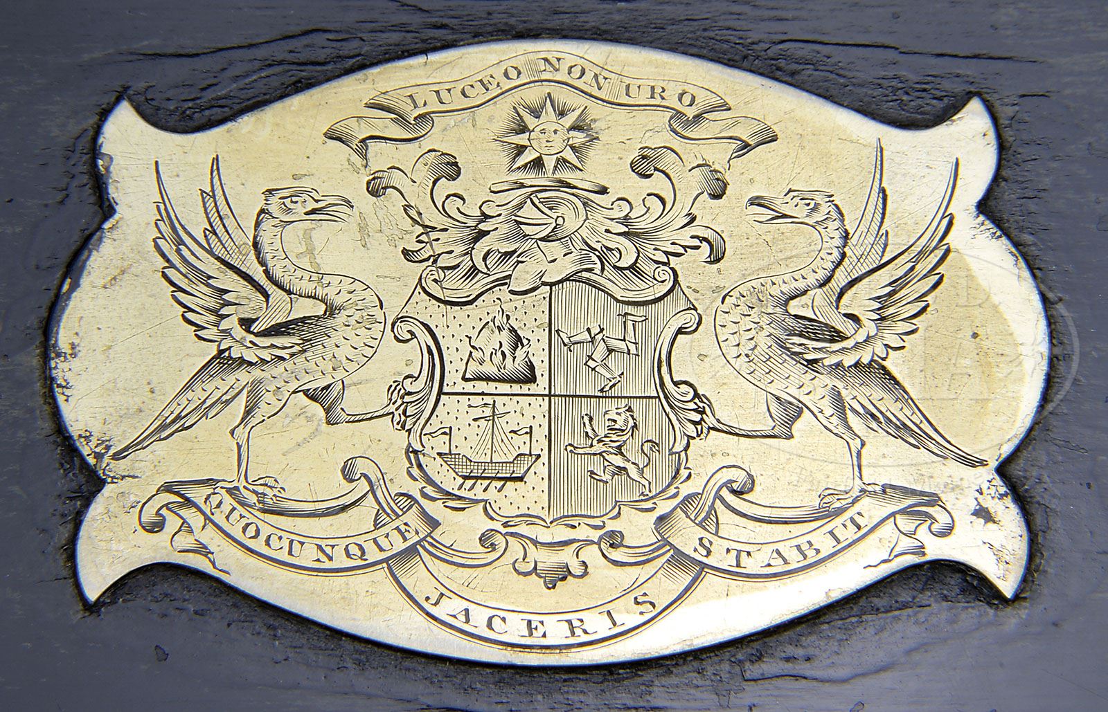 UNIQUE ELABORATELY CASED PAIR OF PERCUSSION RIFLED BELT PISTOLS BY DEVISME OF PARIS CIRCA 1845. SN NSN. Locks, mounts and breeches are elaborately engraved with scrolling foliage. Signed on tail of lock “Devisme a Paris”. Front action locks. Half stocks. Bbls oct with fine Damascus finish and “Devisme Brevete a Paris” etched into top flat. Made like pair of diminutive dueling pistols, these have set triggers and long engraved belt hooks, silver thumbpieces, highly polished, select walnut stocks, original rods and butt traps for caps. Case is of ebonized wood bound with German silver strapwork and German silver bound corners. Escutcheon in lid elaborately engraved with a coat of arms attributed to the Earls of Cromerly and Seaforth. Motto “Luceo non Uro” and “Quo Cunque Jaceris Sctabit”. Interior of case retains original red velvet lining, all original accessories including mold, cap box, screwdriver, mallet and cleaning rods. Original key. Additionally, case sits on elaborately constructed carved ebony stand with little hairy pawed feet of German silver which may or may not be of the period. NOTES: A most unusual pair of pistols by Devisme who is more known for standard French target pistols. These pistols carry extensive early notes, one dated 15 October 1907 wherein new owner is cautioned “never to snap them at random”. Highly desirable and most interesting pair of pistols. PROVENANCE: Frank Greenhall, FL. John Greenhall, son of Frank. Collection of Dr. Douglas Sirkin. CONDITION: Case is excellent. Lining is excellent. Stocks are crisp retaining most original varnish. Mounts are crisp retaining most original polish. Locks are crisp as well. Bbl of one gun has been badly cleaned and has lost much of its Damascus finish and is pitted. Hammer on same pistol has chip out of left side of nose. Bullet mold is pitted and polished. Bbl of other pistol is polished and moderately pitted toward breech. Evidently it was fired and not cleaned properly. 4-49849 MZ42 (6,000-12,000)