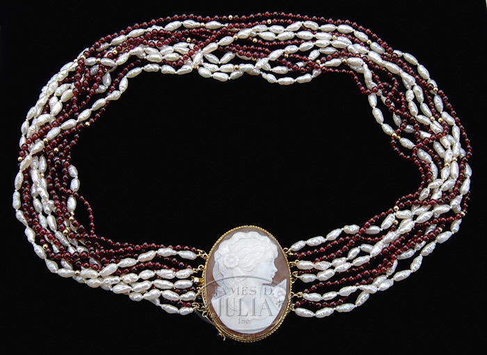 CAMEO, GARNET & PEARL NECKLACE. Very pretty cameo necklace is made up of five strands each of fresh water pearls and round garnet beads. Ten strands are twisted together to give a single rope affect and have 14kt yellow gold beads interspersed. Various strands come together at the large cameo clasp. Cameo is beautifully carved in shell with a lovely woman with flowing hair and flowers in her hair. Back of cameo mounting is stamped “800” within an oval as well as hallmarked with a star and “422 KA”. SIZE: Cameo: 1-1/2″ x 2″. Necklace: 18-1/2″ l. CONDITION: Very good to excellent with one minor dent to bezel around cameo. 5-66243 (500-700)