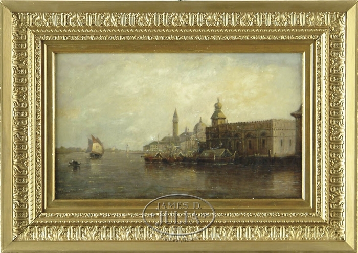 WILLIAM RICHARDSON TYLER (American, 1825-1896) MEDITERRANEAN HARBOR. Oil on canvas scene shows an Italian harbor with buildings and boats moored alongside city wharf. A small gondolier is seen on left next to colorful sailboat. Signed lower left “WR Tyler”. Housed in its original wood frame with gold paint. SIZE: 12” x 20”. CONDITION: Some restoration, inpainting. Good. 9-28075 (2000-4000)