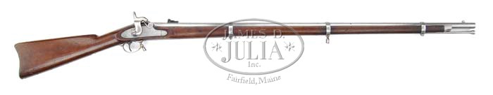 COLT SPECIAL MODEL 1861. SN NSN. 58 Cal. rifled 40″ long bbl marked “VP” over “eagle ” on left breech flat clearly dated 1863at breech, and sub inspectors “H” stamped on bbl tang. Spread winged eagle stamped on bolster. Lock is marked “U.S.” over “COLTS Pt. F.a.M fg. CO.” over “Hartford CT” in three lines. Tail of lock dated 1863, sub inspectors mark “T” visible on left side of hammer. Both inspector cartouche’s visible on left stock flat. A small 3 character indiscernible marking lightly stamped in wood behind bbl tang. Stamped “E.M.C. in front of butt plate. Butt tang is also stamped “U.S.”. CONDITION: Overall condition of metal is very good to fine, as is the wood with only very minor nicks from handling and storage. 1/4″ wide by 1″ long blackened area on left side of stock in region of inspectors mark could be cleaned off and will enhance the appearance. Small 1″ chip of wood on right side of fore end and behind the nose cap. 4-35040 PAS25 (2,000-3,000)