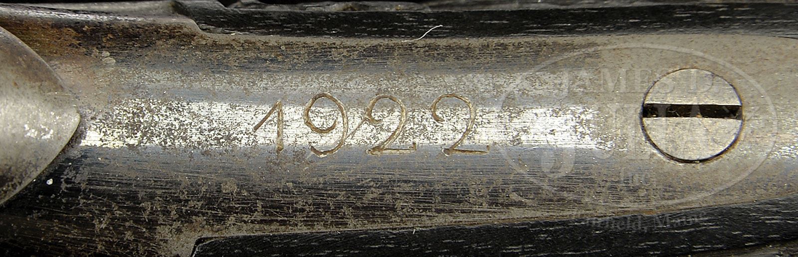 EXTREMELY RARE HIGH ART GOLD INLAID RUSSIAN PINFIRE REVOLVER OF PRESENTATION QUALITY BY JOHANN NORMANN IN TULA. SN NSN. Cal. approximately 7.5mm pinfire. 4-7/8″ bbl, 10.4″ overall. Bbl inlaid in raised gold “GH. I NORMANN IN TULA”. Bbl is fluted and oct at muzzle. This unique revolver has the finest etching portraying Russian officers hunting on the cylinder of a quality virtually unknown on European pinfire revolvers. One can see the actual cut of the uniform coats and hats and the eyes on the small game they are hunting. The leaves on the trees are accurately delineated as well. The frame is etched with a Russian hunter holding a long gun and the other side a recumbent Russian with what appears to be a European man with long hair picking up his blanket. The etching on frame is accented in gold. Oct section of the bbl is inlaid in gold. Trigger guard is etched, as is the recoil shield on the rim. Perhaps the most Russian and the most wonderful feature of this gun is the elaborately carved ebony grip. On the right side amidst florals in raised relief is a raised relief boy with a fig leaf covering his private parts beating a drum. The other side depicts a boy with a pair of cymbals. Butt ends in an incredibly realistic lion head with teeth so accurately rendered one can see the facets of the molars. The eyes are pale amber inlaid with dark amber. Altogether a piece fit for the Hermitage Museum. NOTES: The etching on this revolver closely resembles two revolvers in the collection of Robert M. Lee, one of which was presented to the German Kaiser. Russian revolvers of this quality are seldom, if ever, encountered. Fewer than 5 have surfaced in the past two decades. PROVENANCE: Capt. Clair F. Ogden, Laurel, MD, 1951 by descent to the present owner. See letter from Theodore Dexter to Capt. Ogden dated May 20, 1951. CONDITION: Metal surfaces retain much of their original bright bluing. Hammer retains almost all of its original bluing. Gold is in pristine condition with the exception of a minuscule amount missing from the “L” and “A” in Tula. The ebony grip is pristine except for a very small chip where the top of the grip meets the frame. 4-48396 MZ18 (20,000-30,000)
