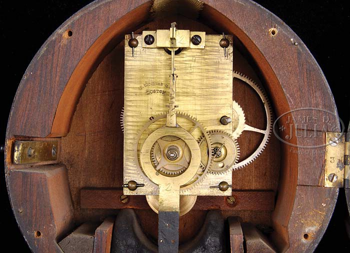 E. HOWARD & CO. NO. 5 ROSEWOOD DECORATED BANJO CLOCK. Second half 19th century. The time only wall clock with original painted dial marked “E. Howard & Co. / Boston”, the case with original eglomise panels, the pendulum stick and damascened brass pendulum bob also original with pendulum lockdown hardware attached. The original brass movement incised with the mark “E. Howard & Co / Boston”. The box base retains the original factory instruction label. SIZE: 29″ h. CONDITION: Overall very good original condition with old original grained surfaces. The painted dial with heavy craquelure and loss to paint around mounting screws. The circular glass panel within a bezel door later replacement. The original movement probably in need of cleaning. Lower eglomise panel also with craquelure. Otherwise very good. Clock is sold with winder, weight and pendulum. 9-98120 (2,500-3,500)
