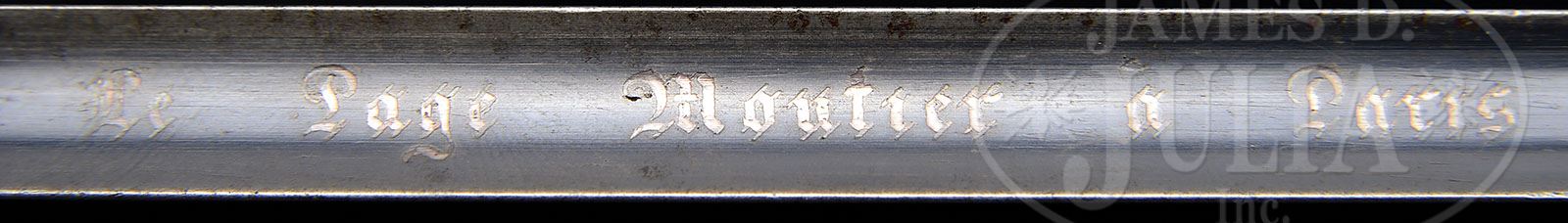 VERY FINE MOUTIER LEPAGE OVER-UNDER PERCUSSION RIFLE. SN NSN. Cal..490 Groove diameter. (10 narrow rounded grooves) 20″ Blued over-under octagonal bbls with solid, concave top rib, silver inlaid “Lepage Moutier a Paris”, is fitted with one standing leaf rear sight with long, flip-up ladder sight dovetailed through, and silver square blade front sight, also dovetailed through. Bottom flat of bottom bbl is silver inlaid “Acier Fondu”. A sling loop is screwed to bottom bbl. A steel ramrod with cylindrical silver tip is held by two silver thimbles with beaded ends attached by screws to left side of bbls. Patent breech with fine acanthus engraving on rib extension, has well filed fences. Breech iron and trigger plate have deeply molded borders, as do unmarked back action island locks with well filed, scroll decorated, tall, serpentine hammers. Cast hallmarked silver scrolled trigger guard has full relief boar’s head on bow, undoubtedly portraying the intended quarry of this fast handling, short barreled rifle. Piano finished, slightly burl figured European walnut straight grip buttstock measures 14-1/8″ over steel buttplate, which matches other furniture in style. Drop at heel: approx 2-1/4″, drop at comb: approx 1-9/16″. Weight: 8 lbs. 7 oz. LOP: 14-1/8″. CONDITION: Excellent. Bbls retain over 85 – 90% of their orig brilliant nitre blue, silvered on high points of octagons and edges of rib. All other metal appears to have been finished bright, and shows some considerable spotting, but no deep pitting. Stock retains nearly all of its orig french polish with numerous minor knocks, dings, and scratches. Worn through and darkening at areas around grip. Bores are excellent, bright and shiny. Locks crisp. 4-49599 MGM44 (10,000-15,000)