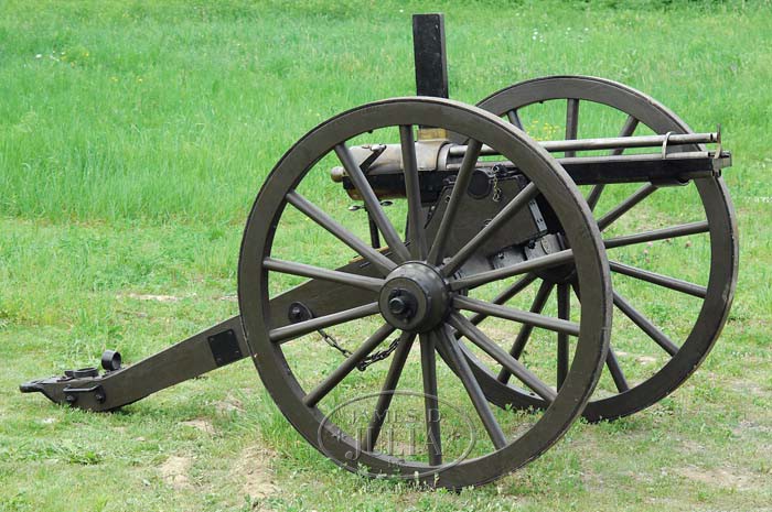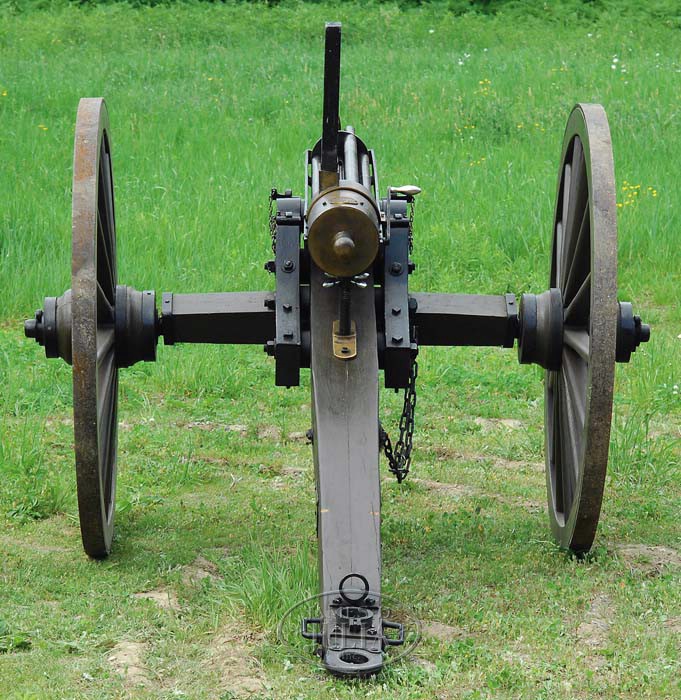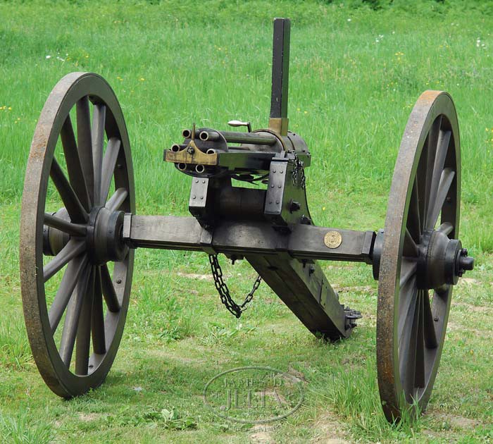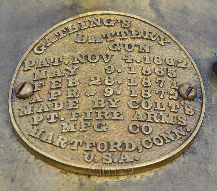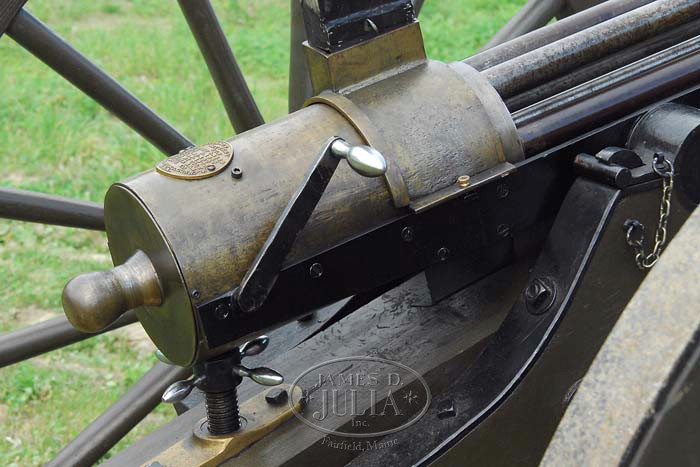 WONDERFUL REPRODUCTION RARE 1″ MODEL 1866 PERCUSSION GATLING GUN ON FIELD CARRIAGE. Cal. 1″. Spectacular hand crafted reproduction 1″ percussion M1866 Gatling gun with 1871 improvements, six 43-1/2″ bbls and 3-5/8″ trunnions with brass housing. mounted on an accurately reproduced 1860’s artillery field carriage which was the same carriage as used on the orig guns. This is the only known reproduction of the now believed extinct M 1866. Only sixty-two of the orig 1″ Gatling guns were ever made, with sixty-one of them made in 1866 and one more in 1871. Reference The Gatling Gun Notebook, Hughes, p. 6 & 11. Six of the orig guns were made at the Miles H. Greenwood Foundry in Cincinnati, Ohio which burned down with all the blueprints & patterns destroyed. Production was moved to the Cincinnati Type Foundry Works where there were thirteen more made and then the Cooper Firearms Mfg. Co. made eight more. Later in 1866 production was transferred to Colt’s Patent Firearms Mfg. Co. in Hartford, apparently where the balance of the production was completed. Most of these were sold to Francis Bannerman in 1902 who resold them to foreign governments and presumably they are now destroyed. Percussion Gatling guns use a separate loaded chamber with percussion musket cap on a nipple at the closed end and are fed from a stick magazine style hopper into the rotating breech mechanism which fires them in their turn and drops the empty out the bottom for re-use. This fine reproduction Gatling is accompanied by 24 machined steel chambers with an O-ring groove around the front end for gas seal. Also accompanied by two of the sheet metal stick magazine hoppers, and 2 boxes of cleaning gear & spare parts. This carriage is by J.C. Bidwell of Pittsburgh and has about 59″ diameter wheels with an approx. 78″ wide axle with standard artillery trail that is approx. 100″ from tip of trail to front of wheels. Consignor states that this Gatling gun has been fired each year at the North/South Skirmish Association Cannon Shoots and is extremely destructive to the targets, more so than the 6-pounder cannons. CONDITION: Fine and complete. Has been fired but not abused. Retains most of its orig finish. Carriage is outstanding retaining most of its orig custom green paint. 4-35108 (20,000-30,000)