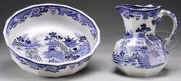 BLUE WILLOW PATTERN WASH BOWL & PITCHER BY MASONS. The large bowl & pitcher having paneled sides, bright blue decoration in the classic Blue Willow pattern. Marked on base “Masons Patent Ironstone China”. Circa 1850. SIZE: Pitcher is 11-1/2″. Bowl 16-1/2″ dia. CONDITION: Very good. 9-98722 (400-600)