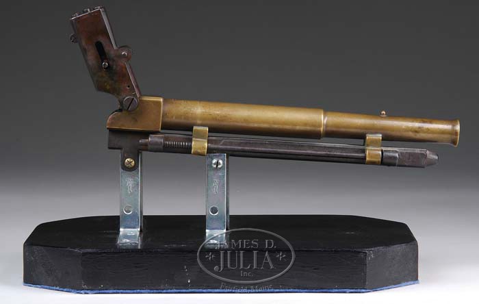 VERY RARE BREECH LOADING WHALING DARTING GUN. SN 11. Cal. Appears to be approx. 20 bore smooth bore, probably fired a short brass blank cartridge to propel the dart. Probably a Pierce Patent from late 19th century. This unusual whaling item is 16-1/4″ long with 13″ stepped rnd brass bbl with flared muzzle, a pin front sight & steel breech block with firing mechanism that has the rear sight a groove on top of the breech block. Bbl & breech block are mounted in brass trunnions that slide on spring loaded iron rods on each side of a square iron bar. These obscure whaling guns were apparently mounted in bow of whale boat & when the whale broached a dart was fired into the body with an explosive charge on the tip with winged grapnels attached to a line which secured the whale to the boat. Few of these rare items remain today and are seldom encountered. This little gun is mounted on a homemade base. CONDITION: Bbl retains a smooth even dark mustard patina with iron a very dark brown patina. Mechanics are fine & seem to function, worn dark bore. 4-35365 JR437 (2,000-3,000)