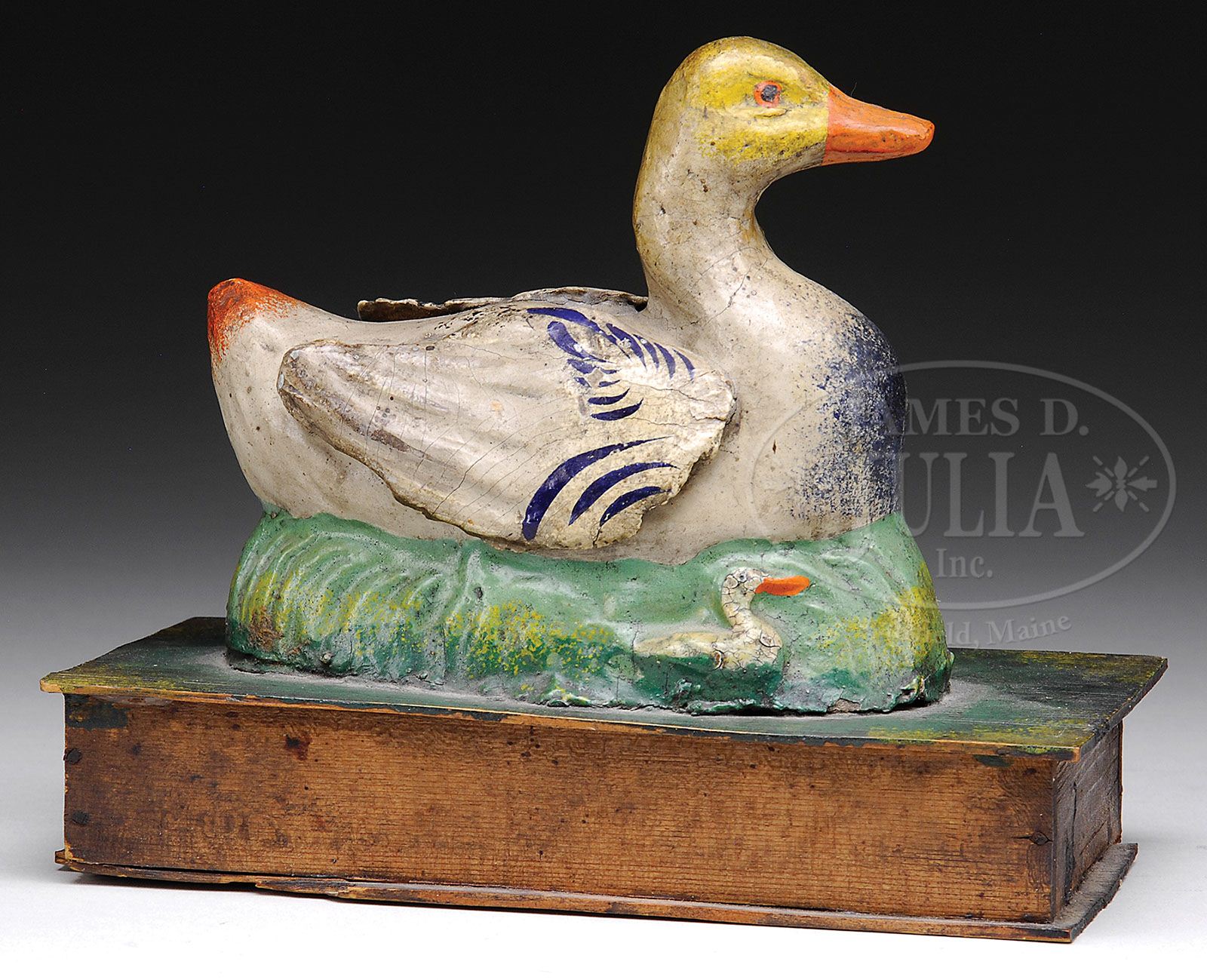 RARE OVERSIZED “DUCK WITH DUCKLINGS” SQUEAK TOY. Second quarter 19th century. This composition and pine example of a molded duck with two ducklings mounted on a rectangular pine box with “squeak” mechanism within. Duck and ducklings with bright polychrome painted surfaces. SIZE: 6-3/4″ h x 7-3/4″ w x 4″ d. CONDITION: Squeaker inoperative, with small losses to base of box. Original painted surfaces with minor abrasions, generally good 9-27777 (700-900)