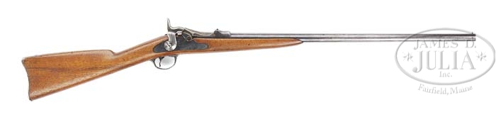 MODEL 1881 SPRINGFIELD TRAPDOOR SHOTGUN. SN 1123. Cal. 20. 26″ bbl, breechblock marked “1881”, lock is marked “US /SPRINGFIELD /1873” in front of spread wing eagle facing muzzle. Trigger guard and buttplate marked “US”. Bottom of stock is unmarked with no splits, cracks or chips. PROVENANCE: Peter Wainwright Collection. CONDITION: Bbl is smooth and retains 10% orig finish, as does breechblock with retains 10% case colors. Lockplate retains about 40% orig colors. Trigger guard and buttplate retain about 10% colors. Overall smooth and in very good condition, as is walnut stock which has a few handling marks, nicks and dings. 4-38190 PAS34 (3,000-5,000)