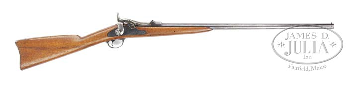 MODEL 1881 SPRINGFIELD TRAPDOOR SHOTGUN. SN 1123. Cal. 20. 26″ bbl, breechblock marked “1881”, lock is marked “US /SPRINGFIELD /1873” in front of spread wing eagle facing muzzle. Trigger guard and buttplate marked “US”. Bottom of stock is unmarked with no splits, cracks or chips. PROVENANCE: Peter Wainwright Collection. CONDITION: Bbl is smooth and retains 10% orig finish, as does breechblock with retains 10% case colors. Lockplate retains about 40% orig colors. Trigger guard and buttplate retain about 10% colors. Overall smooth and in very good condition, as is walnut stock which has a few handling marks, nicks and dings. 4-38190 (1,500-2,500)