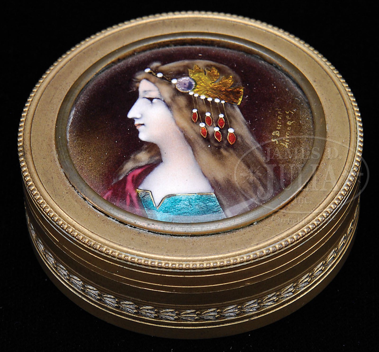 ENAMEL DECORATED PILL BOX BY LIMOGES. The round enamel inset portrait bust of a young woman in green and red dress having long brown hair with a golden hairpiece having dangling red & white decoration. Signed at side “S. Burnet Limoges”. Enamel inset into a round brass box. SIZE: 2-1/2″ dia. CONDITION: Enamel inset is loose in top, otherwise very good. 9-27209 (300-500)