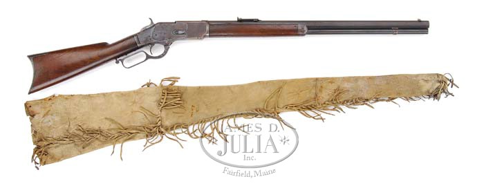 LOT OF WINCHESTER 1ST MODEL 1873 RIFLE & COLT MODEL 1878 DA FRONTIER REVOLVER & BUCKSKIN RIFLE SCABBARD ASSOCIATED WITH CUSTER’S FIGHT AT THE LITTLE BIG HORN. SN AS NOTED. 1)Winchester Model 1873. Cal. 44 WCF (44-40). SN 4751. 1st Model ’73 with 24-1/4″ oct bbl, half nickel front sight and “1873” marked ladder rear sight. It has sgl set trigger & is mounted with uncheckered American walnut with straight stock & crescent buttplate with trap. The serial number is hand engraved on bottom tang and top tang is roll marked “MODEL 1873″ with two holes for tang sight. 2) Colt Model 1878 DA Frontier revolver. Cal. 45 Colt. SN 1034. Nickel finish with 5-1/2” bbl & 1-line Pall Mall London address. It has slightly altered front sight with checkered wood grips & a lanyard loop in the butt. Left front web of trigger guard is marked “45 CAL /B” signifying 45 Boxer caliber but in fact the chambers in the cylinder have been extended to accept 45 Colt. Accompanied by a sgl loop holster that has been completely restitched and most of top part cut away for access to trigger guard. Possibly made from an old cavalry holster. 3) Indian made, brain tanned deer skin sheath made of two pieces, overall about 44″ with a sinew sewn seam down entire bottom edge and at the joint in the middle. Both bottom seam & joint seam have 3″ fringe. This lot is accompanied by a large packet of information relating to Moses A. Welch who served in the Civil War until July 1865 when he was mustered out as a Corporal. Next reference in this material relating to Mr. Welch are copies of a series of letters dating from 1866 into 1873 from Mr. Welch to his family discussing finances & life at the Blackfoot Indian Agency in Montana Territory. In addition there is an undated typewritten letter addressed to The Museum of the Coos & Curry Co. Pioneer & History Association of Coquille, Oregon. Body of letter is transferring photographs of Indian Chiefs and a “gun that was shot at the Battle of Little Big Horn”. Letter further states that “They belonged to my father’s brother, Moses A. Welch. He was a gold miner and worked at the Blackfoot Indian Reservation in Montana Territory and got the gun after it was surrendered by a Indian warrior that helped kill Gen. Custer and his men.”. He then asks that they “Please show the gun and leather sheath only in a locked cabinet as I want to pick them up by September.”. The letter is signed George G. Welch. Also accompanied by copies of discharge & pension papers for Moses Welch. Additionally accompanying is a Cody Firearms Museum letter identifying this rifle as found and showing shipment Aug. 23, 1875 to order #3931. The possibility and even probability certainly exists that this rifle was used at the Custer Fight at the Little Big Horn. The Indian made rifle scabbard certainly might support the fact that it was obtained at the Blackfoot Indian Reservation in the late 1870’s. Obviously the revolver was not involved at the Custer fight since it would have been made a year to two years after the massacre. It is, however, obviously a hard used frontier revolver that was altered to accept cartridges readily available on the frontier. Also accompanying this lot is a copy of a Winchester Factory letter which identifies this gun as having been received in the warehouse on August 19, 1875 and shipped from the warehouse on August 23, 1875 as order number “3931”. CONDITION: 1) About fine. Bbl retains about 50% orig blue, mostly in sheltered areas, with balance a blue/brown patina with a few spots of pitting. Magazine tube retains about 90% dull orig blue with a few spots of pitting. Receiver retains 15-20% orig blue in sheltered areas with balance a blue/brown patina with candy striping down both sides. Wood is sound with minor nicks & scratches and wear at carry point and retains a fine hand worn patina. Lever is slightly sprung but functions perfectly, otherwise mechanics are fine. Strong bore with light pitting. 2) Good to very good. Overall retains about 50% nickel finish with balance cleaned bare metal & dark patina. Grips are very worn but solid. Loading gate is broken away. Mechanics need attention, strong bright bore. Holster is fine. 3) Fine, slightly dry but mostly soft & flexible with a smoked dark patina showing heavy wear on the fringe with some light staining & soil. 4-35064 JR512 (10,000-15,000)