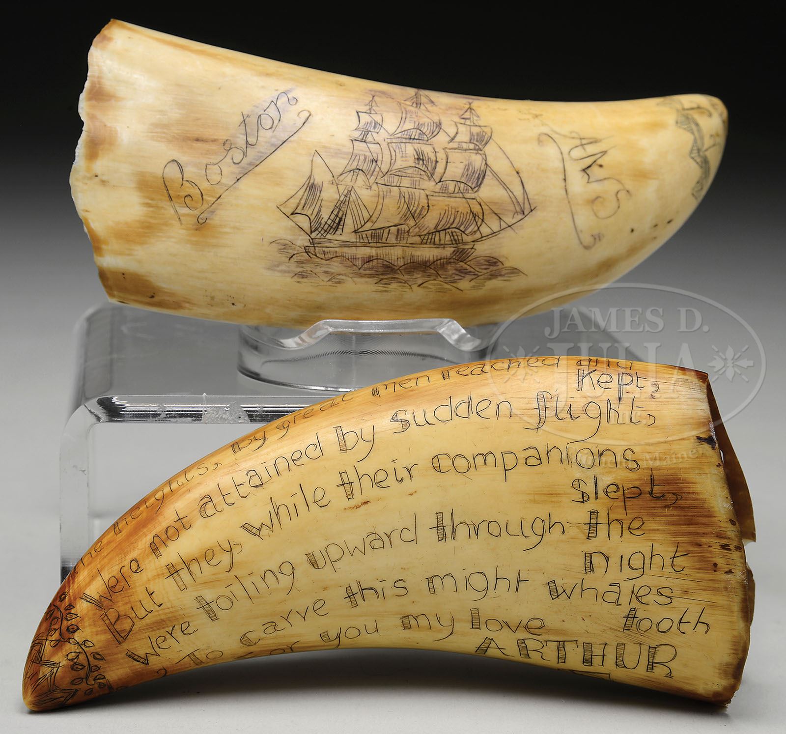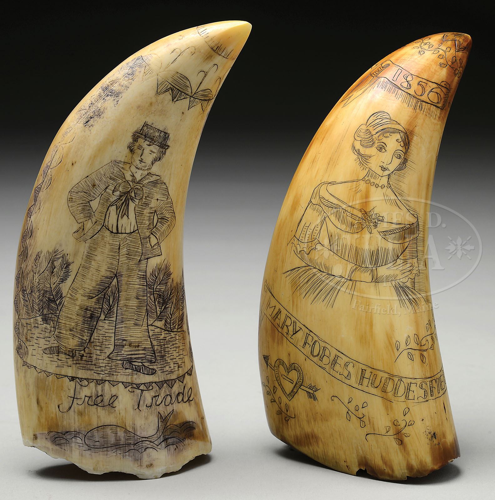 TWO SCRIMSHAW WHALE’S TEETH. Mid-20th century, New England. The first scrimmed depicting Jack Tar posed in a landscape above the words “Free Trade“. The reverse scrimmed with a three masted sailing ship flanked by the words “Boston” and “AWS“. The second scrimmed with the portrait of a young woman beneath which is the name “MARY FOBES HUDDESFIELD” above a heart pierced with an arrow and dated 1856. Reverse scrimmed with lines of verse. SIZE: 1) 7″ l. 2) 6-1/2″ l. CONDITION: With patinated surfaces. Generally good. 9-28607, 9-28616 (1,000-1,500)