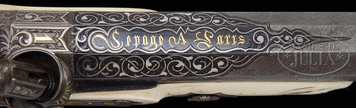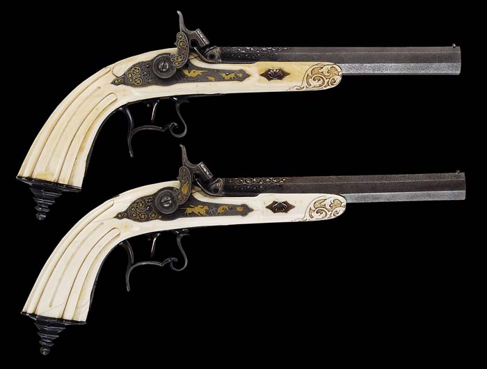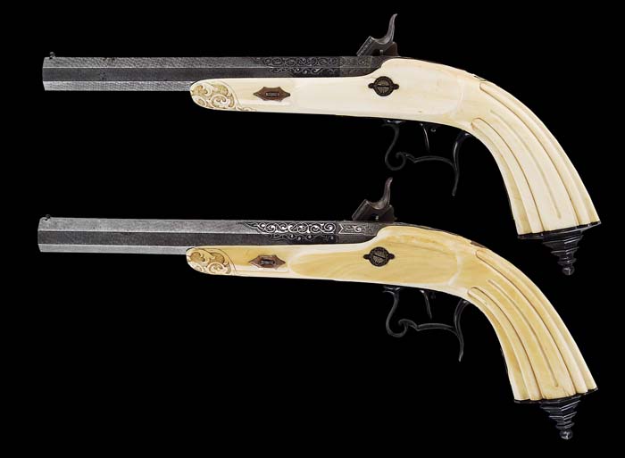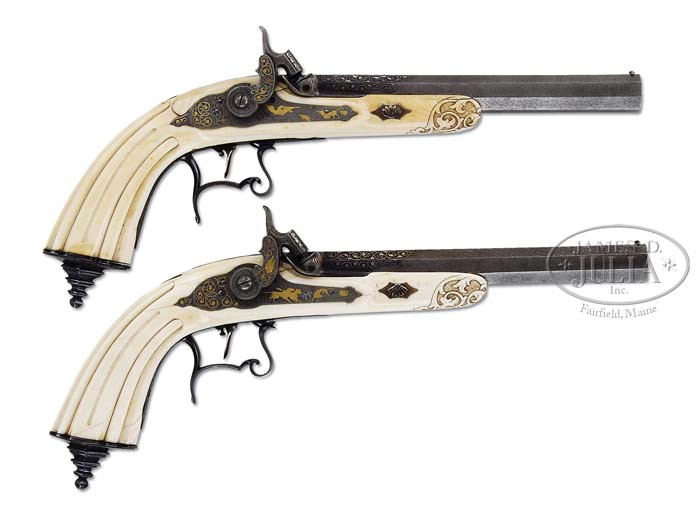 EXTREMELY RARE CASED PAIR OF IVORY STOCKED LEPAGE PERCUSSION TARGET/DUELING PISTOLS. SN NONE. Cal. About 65. Extraordinary pair of pistols with 8-1/4″ oct Damascus bbls including breech plug. Bbls have tiny blade dovetail front sights with engraved foliate arabesque patterns over chamber areas with platinum wire inlay and blued background. Top flats over the chambers have maker’s name inlaid in gold “Lepage A Paris”. Breech plugs & tangs are engraved to match with platinum wire inlay in the patterns with gold inlaid “1” and “2” respectively. Top tang on #1 has the small gold vignette of a bulldog head with a gold & platinum goat vignette on #2. Lockplates & hammers are beautifully engraved and inlaid in multi-colored gold wire with dog’s heads on sides of hammers and game scenes with hunting dogs & birds. They have sgl set triggers. The elaborate curled trigger guards with finger rest spurs are beautifully blued with multi-color gold & silver inlay with gold & platinum vignette of a dog on #1 and a deer on #2. Pistols are mounted in 1-pc ivory half stocks with fluted butts and stepped fluted buttcaps with long finials that are beautifully engraved and inlaid with gold & silver wire inlay. Stocks have raised side panels and are secured with a sgl rose gold wedge plate with scallop shell head through elliptical gold escutcheons. Tips of forestocks are relief carved in foliate arabesque patterns with stippled background. The sgl lockplate screws & escutcheons are engraved and gold wire inlaid. This fantastic set is accompanied by its orig, elaborate, deluxe, brass bound rosewood casing. Lid has full brass edges with a brass band inlay around outer edge and also in a rectangle around the center gold washed scalloped presentation panel. Front of case has a wide spaced mortised brass lock with matching escutcheon & brass band inlay in front. Interior is burgundy velvet lined with rosettes in the lid, French fitted in the bottom for the two pistols and a complete set of accessories, including ivory stocked turn screw, ivory & ebony mallet, two ivory & ebony round parts boxes, an ivory & ebony cleaning rod with jag, an ebony & silver ramrod, the orig sgl cavity bullet mold with sprue cutter, octagonal powder measure, octagonal steel oil bottle with beaded turned top, patch cutter, worm for the cleaning jag that is blued with a silver ball guide and brush for the cleaning jag . Also included is a bag-shaped copper & silver flask. Under one of the parts boxes is a small folded piece of paper which states that this set is “from the collection Paul Gruenberg in Memphis Tenn”. Note also states that this set is pictured on p. 174 in The Collecting of Guns, Serven, also pictured in Armseller 1953, Dexter, and in an early American Rifleman magazine. This is truly an extraordinary set worthy of the most discerning collector or museum collection. PROVENANCE: H.H. Thomas Collection. CONDITION: Extraordinarily fine. Pistols appear to be new & unfired retaining virtually all of their orig factory finish on the metal with great Damascus Pattern on the bbls. Stocks have various age lines and an age crack on pistol #2, but overall are sound and retain wonderful ivory patina. Set triggers need adjusting, otherwise mechanics are fine, bright shiny bores. Case has several grain checks in the lid with light handling & storage nicks & scratches, otherwise is sound and retains most of its orig varnish. Lining in the lid is moderately faded with some minor staining from the flask. Bottom is lightly to moderately faded with light soil and minor damage from the pistol sights. Accessories are all extremely fine with flask showing light wear as though it had been used for other pistols. 4-36653 JR105 (70,000-100,000)