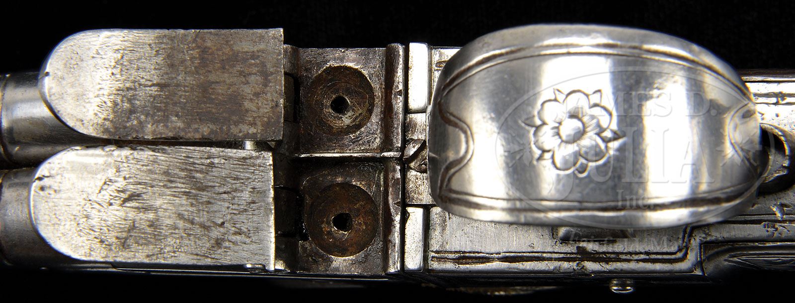 RARE AND UNUSUAL 4-BARRELED ALL STEEL CONTINENTAL TURNOVER FLINTLOCK PISTOL INSCRIBED MICHEL LEPAGE. SN NSN. One often sees this type of pistol in single bbl form marked Segalas or with 2 bbls side by side marked Segalas; however 4-bbl flintlock pistols of this type are very unusual. Pistol has nicely engraved steel butt, stands of arms and scrolls, cannon bbls are deeply rifled. Frame is inscribed “Michel Lepage”. However pistol is more likely Belgian than French. PROVENANCE: See Der Neue Stockel, 1979, by Heer, p. 703. A California collection. Collection of Dr. Douglas Sirkin. CONDITION: Steel polished brightly, minor pitting. Frizzens appear all orig. Both hammers repaired/replaced. 4-49868 MRZ54 (2,000-4,000)