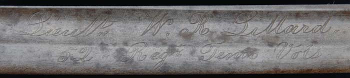 RARE CONFEDERATE INSCRIBED STAFF AND FIELD OFFICER’S SWORD. 29-7/8” unstopped fullered blade is engraved “Lieut.W. R. Lillard, 52nd Tenn. Vols”. This sword is in untouched attic condition with excellent grip and fine patina to brass and blade. You cannot find a nicer example of this classic Confederate pattern, especially with impeccable identification to a Confederate officer. Confederate Gen. Joe Shelby carried this same pattern sword, but his was not etched. Confederate swords with names etched on blade are rare. This scarce pattern sword with the floating “CS” decoration in the hilt was made by Leech & Rigdon. Leech & Rigdon made swords in Memphis, TN., Columbus, MS and Greensboro, GA. A nearly identical etched sword to Lt. Alston Moffitt of the 51st TN. is found in the Smithsonian Institute. It may not be a coincidence that Lt. Moffitt’s sword and the sword here are nearly identical as the 51st and the 52nd TN regiments were consolidated in 1862 and both officers would have chance to buy swords at same locations. This dbl-line engraving style seems to be unique to Leech and Rigdon products and this is best example known to us. Lt. Lillard joined the Army as a private in 1861, later being promoted to officer then serving the remainder of war until he was captured and sent to Johnson’s Island as a prisoner of war where he was paroled in 1865. The 52nd TN Regiment was involved in battles in the Western theater including Fort Donelson, Shiloh, Perryville, Chickamauga, the Atlanta campaign and Franklin. CONDITION: Blade is gray/bright and uncleaned with areas of rust and pitting. Leather grip wrap is excellent with only minor crazing. Twisted brass wire is excellent. Brass hilt exhibits excellent patina. 8-76201 JS2 (25,000-30,000)