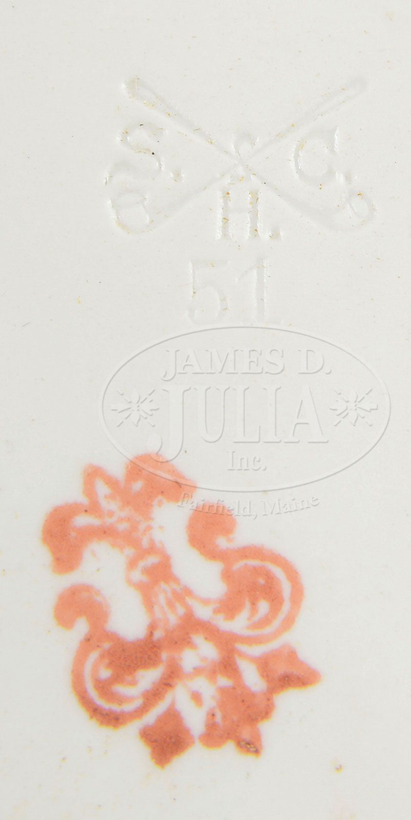SMALL OVAL HAND-PAINTED PORCELAIN PLAQUE OF A YOUNG WOMAN. The back having a “Fleur de Lis” imprinted mark and impressed mark “SCH” in between crossed lines. Portrait of a young girl with white headdress and white shawl. Housed in a gilt carved wood Flemish style frame. SIZE: 3-1/2″ x 2-3/4″. Overall: 7-1/2″ x 7″. CONDITION: Very good. 9-27495 (400-600)