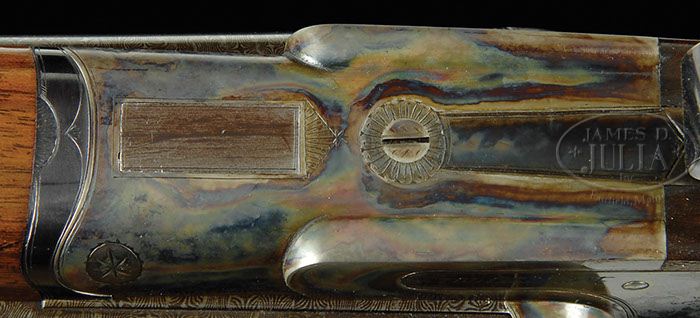 HIGH CONDITION L. C. SMITH SYRACUSE QUALITY 2 WILD FOWLER. SN 16797. Cal. 10 Bore. 3″ Chambers. Although the lowest grade cataloged at the time, this gun is very well appointed with 32″ fine very heavy Damascus bbls, with matted, concave game rib, stamped “L. C. Smith. Maker, Syracuse, N.Y.” and “Damascus Steel Barrels” on tops. L. C. Smith markings are also discernible under rib matting. Bbl flats are stamped with SN and “2”. Case hardened action with exceptionally large fences to accommodate heavy ten gauge bbls, features three position automatic safety with double line border engraving, and a flourish of scroll on each lockplate, which are also engraved “L. C. Smith”. Water table is stamped with SN, “2”, and “Pat’d Mar, 20 83”. Blued trigger guard has scroll on bow, and SN at grip. Nicely streaked European walnut semi-pistol grip buttstock measures 14-1/4″ over checkered hard rubber original buttplate, embossed with scene of dog and falling duck, and “THE L.C. SMITH TRAP GUN”. 28 LPI point pattern checkering is borderless. Matching splinter forend has inset shaped ebony tip with L. C. Smith’s patent spring tension fastener with patent date and SN on iron. Bore diameter: left -.795, right -.792. Bore restrictions: left -.036, right -.037. Wall thickness: left -.036, right -.038. Drop at heel: 3-3/4″, drop at comb: 2-1/4″. Weight: 10 lbs. 4 oz, LOP 14-1/4″. CONDITION: Exceptionally fine. Bbls retain 98% of their orig dramatic Damascus finish, with only the slightest of silvering at muzzles, and a couple of small light spots 14″ from muzzles on bottoms of both bbls. Action retains nearly all of its vivid orig case hardening color, and lacquer, only somewhat dulled on fences and bottom, mostly from frosting of lacquer. Lockplates retain nearly all of their vivid color and lacquer. Top lever is slightly silvered at thumbpiece. Trigger guard retains 60 – 70% of its orig brilliant fire blue, flaked and grayed at tang. Stocks retain nearly all of their orig varnish finish, which have a few very minor marks, finish lightly crazed overall, and appear untouched. Buttplate has a number of minor scratches at heel, is otherwise excellent, with some slight discoloration in sporting scene. Mounting screws retain most of their blue. Bores are excellent, bright and shiny throughout. Gun is as tight as new. Possibly the highest condition early ten bore in existence, as most saw extensive hard use. This gun shows scant evidence of having ever been fired. 4-46250 MGM49 (5,000-8,000)