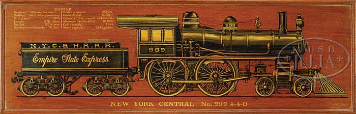 DESIGN PAINTING OF THE EMPIRE STATE EXPRESS STEAM LOCOMOTIVE. Circa 1910. This lifelike rendering of the New York Central Railroad No 999 Steam Engine Locomotive painted on a mahogany plaque including specifications painted in the upper left hand corner. The artist’s initials “JWE 1910” painted in lower right hand corner, the reverse with a label identifying the artist as “John W. Elder / 113 E. 118th St. / N.Y.C. / Industrial Model Builder”. John Wallace Elder (1872-1954). Born in Ireland, emigrated to Canada and then the United States in the late 19th Century. He became a master steam fitter in 1902; shop steward; master draftsman and industrial model builder during the 1920’s & 30’s at the Hunt’s Point Power house in Bronx, New York. SIZE: 11-1/2″ x 36-1/4″. CONDITION: All with original surfaces, now with slight craquelure. No restoration noted. Very good overall. 9-98525 (1,200-1,800)